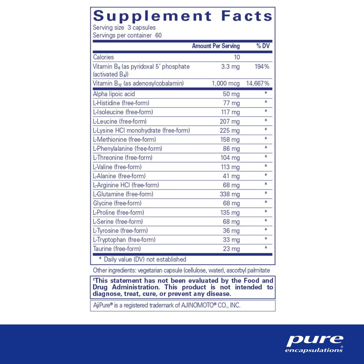 Amino-NR is an amino acid dietary supplement that supports athletic activity, immune function, and daily wellness. Dietary amino acids provide important support for athletic training by promoting muscle performance and recovery. From trained athletes to the elderly, dietary amino acids also play an important role in immune health, primarily attributed to support for healthy glutamine and glutathione levels. Alpha lipoic acid and adenosylcobalamin provide additional support for mitochondrial function and energy. Adenosylcobalamin is the form of vitamin B12 active in mitochondria, promoting mitochondrial energy (ATP) production, in part by supporting MCM enzyme activity, which declines with age. Animal studies suggest it specifically enhances mitochondrial bioenergetics, promotes type IIA fast twitch muscle fiber size during aging, and stabilizes neuro-muscular junctions.10 Vitamin B6 acts as a cofactor for healthy amino acid and energy metabolism.