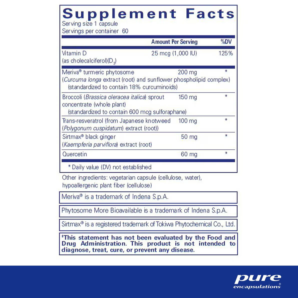 Balanced Immune is designed to support immune balance and tissue integrity, in part by targeting the NLRP and NF-κB pathways to modulate cytokine production. NLRP (NOD-like receptor proteins) act as intracellular sensors to oxidative and environmental stressors. Research suggests curcumin and vitamin D support healthy cellular responses by modulating this pathway. The formula also promotes multiple enzyme and gene transcription pathways implicated in nutrient metabolism, detoxification and cellular protection against oxidative stress. Black ginger and resveratrol promote healthy SIRT1 protein levels. SIRT1 supports cellular homeostasis, plays an important role in insulin secretion and glucose homeostasis, and affects glucose and lipid metabolism in the liver. In a double-blind, placebo-controlled, crossover study, 100 mg of Sirtmax black ginger extract for seven weeks supported healthy glucose metabolism and weight management , while in vitro studies on its active constituents suggest a five-fold increase in SIRT1 activity compared to resveratrol. Sulforaphane and resveratrol support the activity of Nrf2, a transcription factor that supports cellular function by promoting cellular detoxification and protection against oxidative stress.