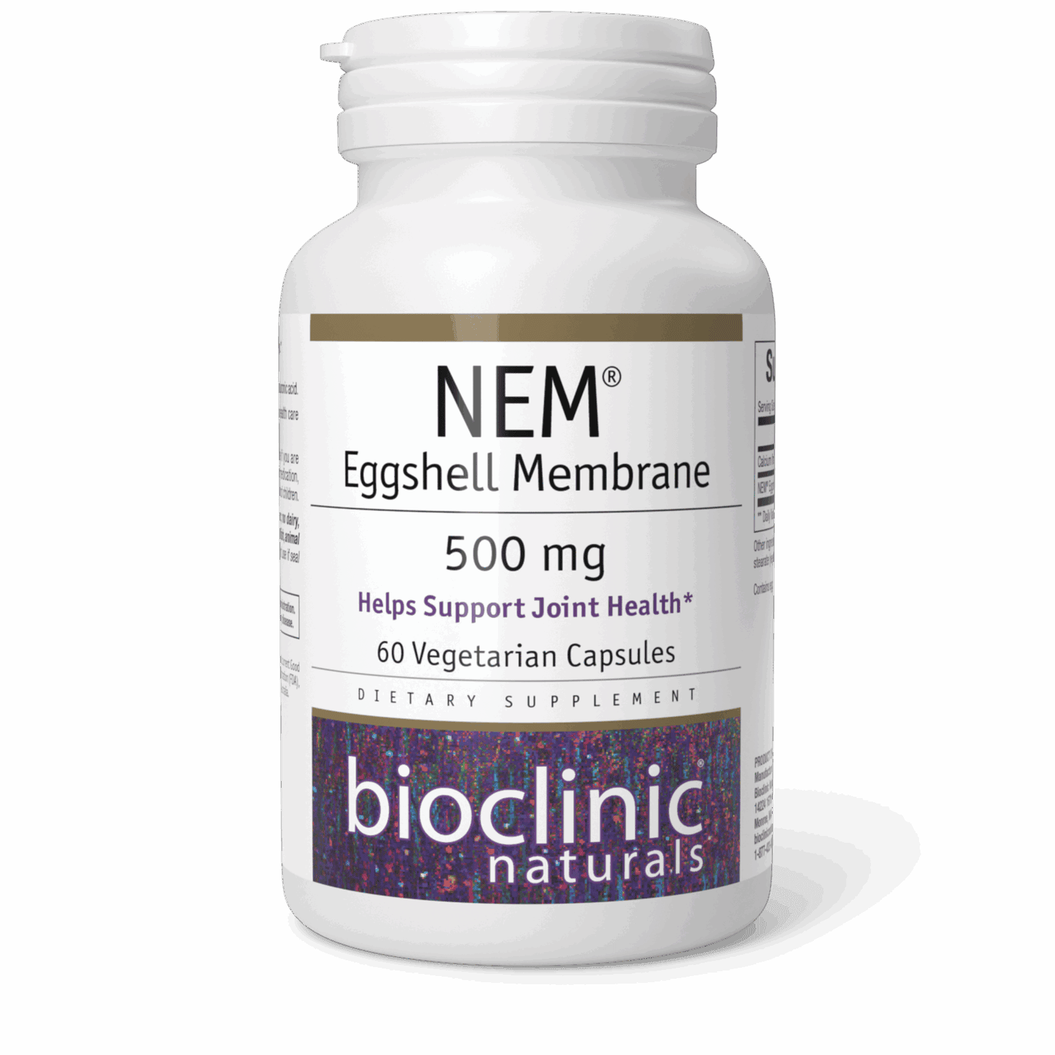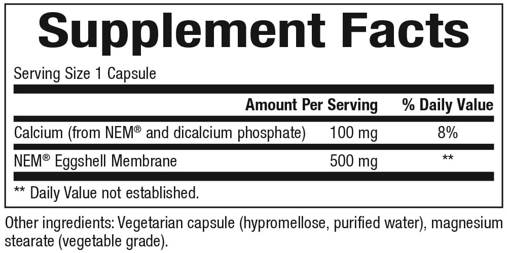 Benefits: Natural Eggshell Membrane (NEM) is clinically proven to reduce joint pain and stiffness resulting from osteoarthritis; Clinically shown to reduce pain and stiffness resulting from moderate-intensity aerobic exercise; Pain, stiffness, and flexibility shown to improve within days of use; NEM provides multiple joint nutrients, including glucosamine, chondroitin, and collagen type I; One vegetarian capsule of NEM per day is the clinically proven dose.