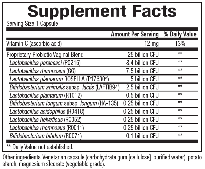 Comprised of 10 strains of Lactobacillus and Bifidobacterium, one capsule per day provides a clinically studied dose of 25 billion CFUs. These probiotic species support a healthy vaginal ecosystem through multiple mechanisms, supporting the healthy function of local immunity and maintaining the normal production of lactic acid, hydrogen peroxide, and bacteriocins already within the normal range. Lactobacilli normally comprise at least 70% of the vaginal microbiome, with oral probiotic supplementation supporting a healthy mix of microbiota and maintaining organisms such as Candida ssp. already within the normal range.