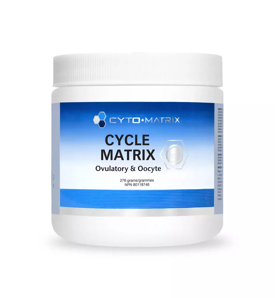 Infertility is a rising health concern for Canadians, with as many as 1 in 6 couples currently experiencing difficulties with conception. Of course, infertility may arise as a result of male or female health issues, or some combination of concerns with both partners. While there may be multiple underlying causes or complicating factors, in women the cause is often related to egg production, egg quality, menstrual irregularities or hormonal imbalances. Cycle Matrix - Ovulatory and Oocyte Support by Cyto-Matrix combines a selection of natural health ingredients to target and improve these parameters in females experiencing infertility. Suggested Use: Adult women - Take 1 scoop per day in water or juice or as directed by a healthcare professional. Take with food. 400 mcg of folate per day is adequate for most women (to reduce the risk of neural tube defects). Consult a healthcare professional to determine if you would benefit from additional folate before taking this product.