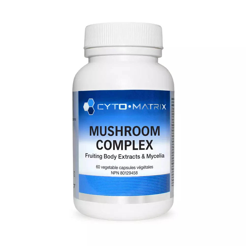 Mushroom Complex includes a blend of seven medicinal mushrooms to provide synergistic health benefits: Lion’s Mane (Hericium erinaceus): known particularly for its ability to support the neurological system and cognitive function. Turkey Tail (Trametes versicolor): has been studied for its prebiotic actions and subsequent support of the microbiome, in addition to promoting a healthy immune response, cellular differentiation and metabolic function. Reishi (Ganoderma lucidum): known most for its ability to provide adaptogenic support during times of stress and promote healthy cellular differentiation, but also can support immune modulation and improved metabolism. Cordyceps (Codyceps militaris): shown to support exercise performance, kidney health, metabolic function and healthy aging. Chaga (Inonotus obliquus): known generally for its anti-inflammatory, anti-oxidant and metabolic support. Maitaike (Grifola frondosa): used for general immune support, healthy cellular differentiation and improving metabolic function. Shiitake (Lentinula edodes): a rich source of vitamins and minerals, this mushroom is often used in culinary dishes and has been shown to support general immune health, improve metabolic function and reduce inflammation. Collectively, this blend of medicinal mushrooms is indicated for overall improved immune responses, metabolism, stress responses and organ protection.