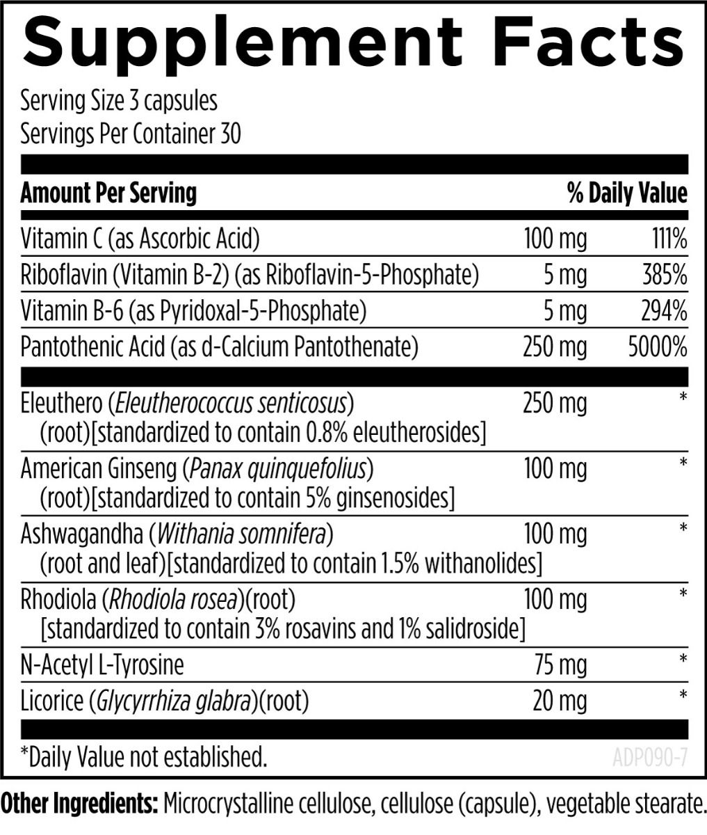 Adrenotone is a combination of standardized adaptogenic herbs and nutrients that are known to contribute to the support of adrenal health and function. This product is designed to help support healthy cortisol metabolism, hypothalamic and pituitary function (HPA axis), and catecholamine production (dopamine, norepinephrine, and epinephrine).