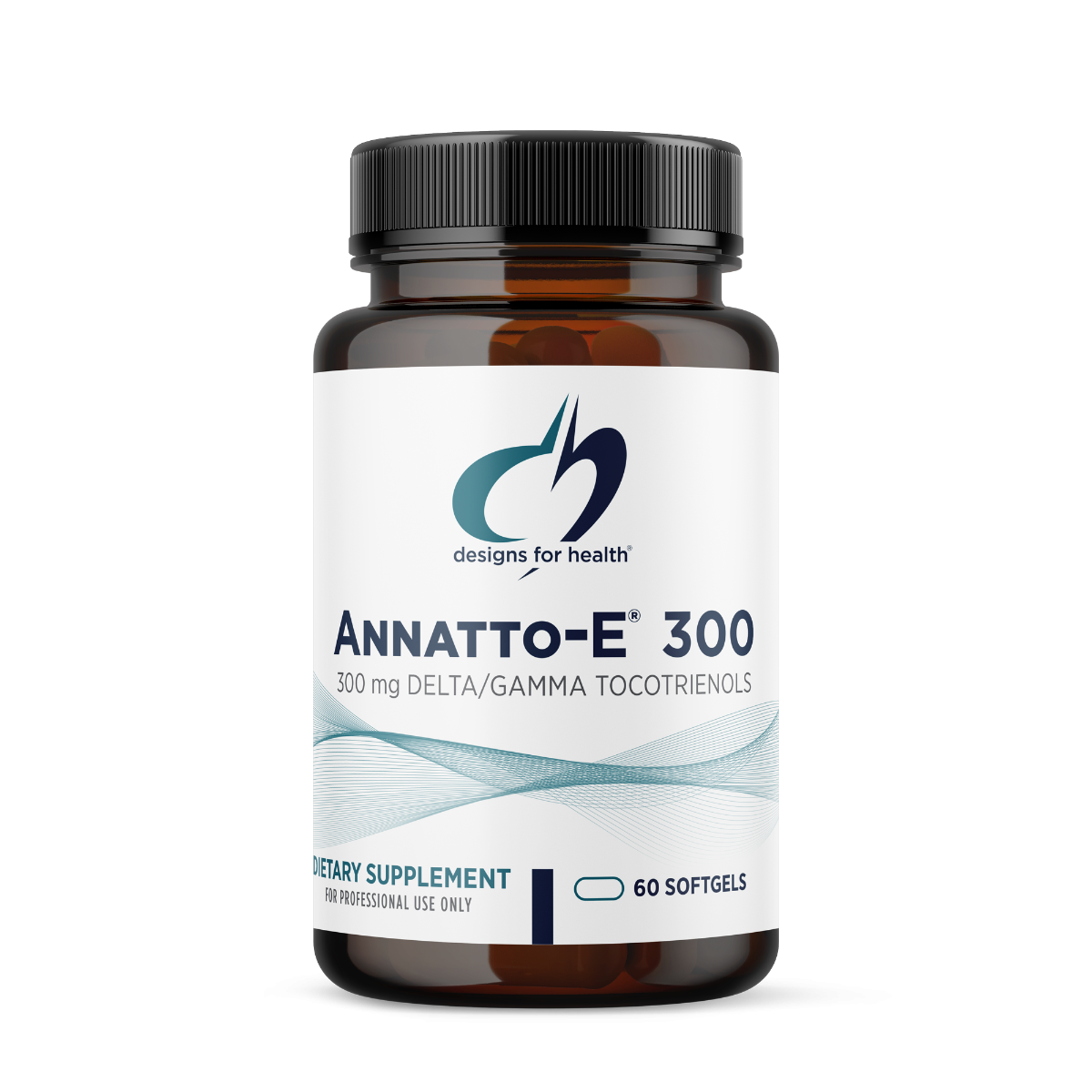 Annatto-E 300 contains 300 mg per softgel of delta/gamma tocotrienols. Commercial vitamin E supplements are typically rich in tocopherols and low or absent in tocotrienols; however, tocotrienol fractions have unique beneficial effects across a variety of tissues that make them desirable for supporting many aspects of health. Research indicates that tocopherols — especially alpha-tocopherol — may interfere with key clinical effects of tocotrienols, so it may be best to take tocotrienols alone, without tocopherols.