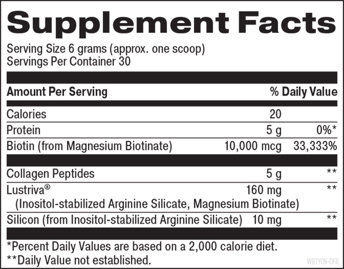 Beyond Brilliance is a convenient, biotin-rich collagen powder that uniquely combines key nutrients for radiant hair, skin, and nails. It features hydrolyzed collagen peptides and Lustriva, a patented, clinically researched blend of stabilized biotin and silica. Evidence suggests that Lustriva may help promote hair fullness, optimal skin texture and hydration, and nail strength. This unflavored and unsweetened powder is optimal for mixing with liquids to help you shine and sustain from the inside out.