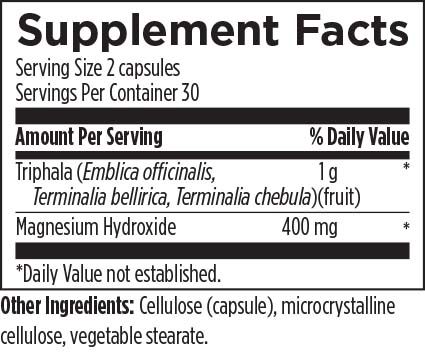 Colon Rx uses two research-backed ingredients to help improve bowel motility and tonicity in people with occasional constipation. Magnesium hydroxide, a well-known ingredient that works by osmosis, draws water from surrounding tissues to the intestines; this local increase of water not only softens the stool, but it also has a positive influence on the volume of the feces, which promotes intestinal motility. In the Ayurvedic tradition, Triphala, a classic formula, consists of three fruits, Amalaki, bibhitaki, and haritaki. Amalaki (known as Indian gooseberry or amla) is considered one of the best rejuvenating herbs. In addition to its laxative effects, Haritaki also has astringent properties and balances Vata. Bibhitaki is an excellent rejuvenative, with both laxative and astringent properties. It balances the Kapha dosha. Colon Rx can be used for short periods of time as a fast-acting mild laxative for occasional constipation or as a daily bowel tonic.