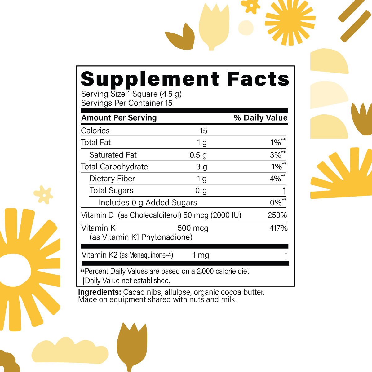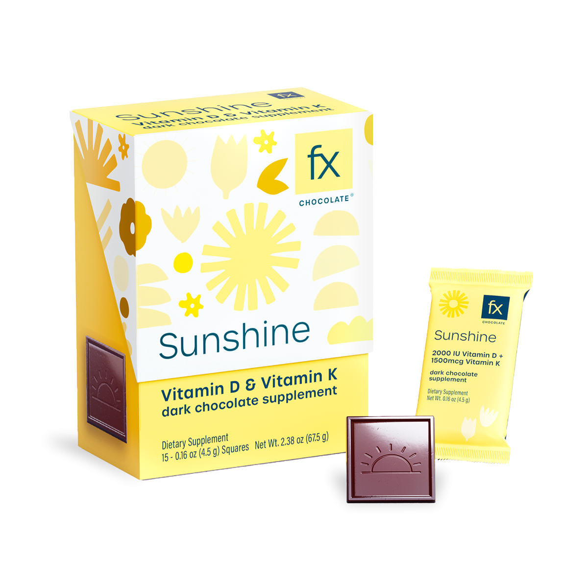 Fx Sunshine is a synergistic blend of vitamin D and bioavailable forms of vitamin K infused in 60% dark chocolate designed to help promote bone and cardiovascular health, immune function, and a positive mental outlook.* This formula combines 50 mcg (2,000 IU) of vitamin D3, 1 mg of vitamin K2 (as MK-4), and 500 mcg of vitamin K1 per 1-square serving. This combination of vitamins D and K may help balance the body’s calcium needs while promoting bone strength and supporting immune health. Fx Chocolate® contains zero grams of sugar and is sweetened with allulose, a sweetening agent that is found naturally in jackfruit, figs, and raisins, with no bitterness or unpleasant aftertaste.