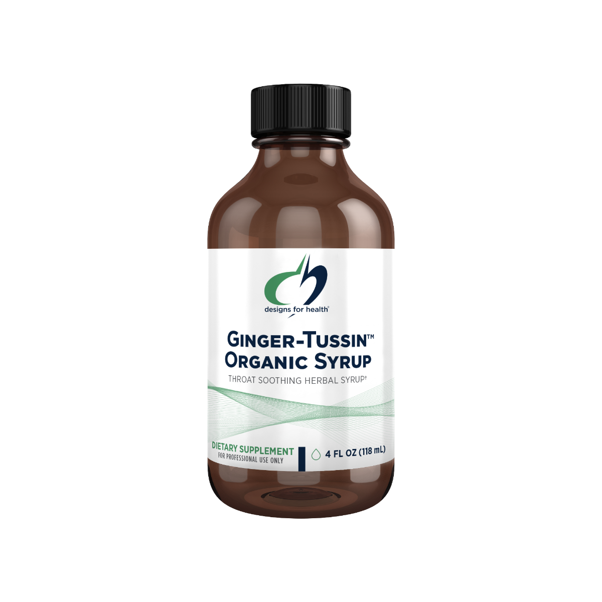 Ginger-Tussin Organic Syrup is a pleasant-tasting, herbal syrup elixir that helps soothe the throat and supports occasional cough. It features organic ginger, lovage, and wild cherry extract to support immune function and antioxidant status. The base of this syrup is certified organic vegetable glycerin and certified organic honey.