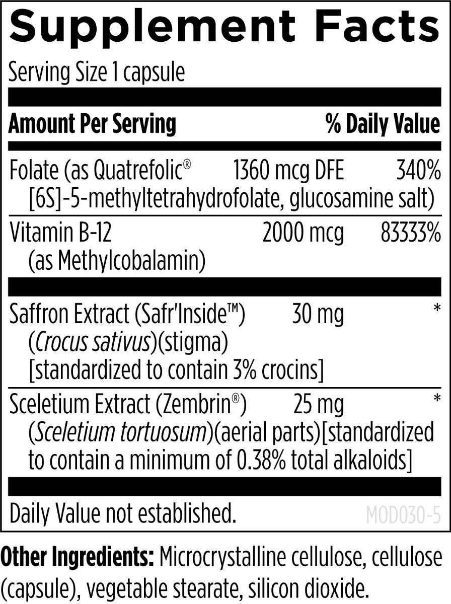 Mood-Stasis is a unique blend of vitamins and botanicals that work synergistically to support a calm and positive mental outlook. It is formulated with saffron and sceletium extracts along with methylated forms of vitamin B12 and folate that have been shown to support a normal stress response.