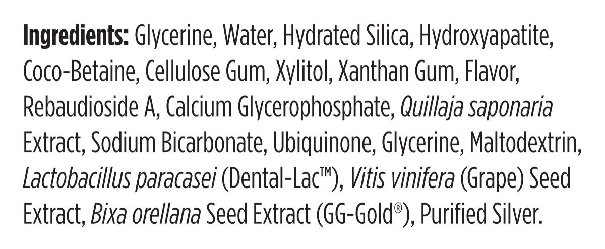 PerioBiotic Silver is a fluoride-free, probiotic toothpaste with whitening hydroxyapatite, purified silver, CoQ10, grape seed extract, and Dental-Lac, a strain of Lactobacillus paracasei. Dental-Lac has been shown in clinical research to help support oral microbial balance and periodontal health. Hydroxyapatite is the primary structural component of enamel. PerioBiotic Silver may help maintain clean, bright teeth, while supporting normal remineralization and overall shine. Suitable for individuals concerned with sensitivity.