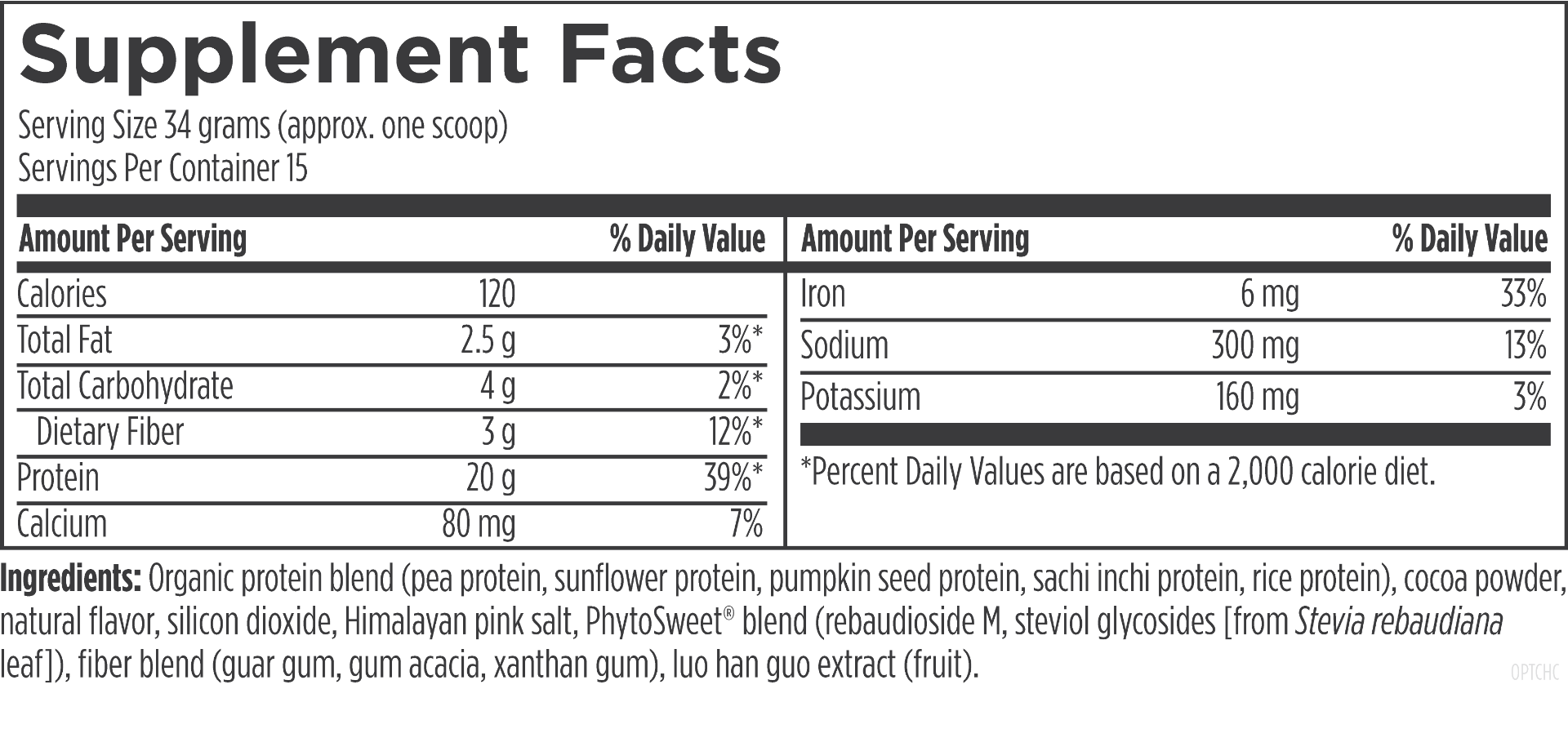 It features an organic protein blend primarily composed of organic pea protein with additional protein from organic sunflower, pumpkin seed, sacha inchi, and rice sources. Phytotein provides 20 g of protein per 1-scoop serving. This formula is a true vegetarian- and vegan-friendly protein powder that is easily digestible and absorbed in the body and offers a variety of nutritional benefits. Phytotein is a pleasant-tasting protein alternative for individuals with allergies or sensitivities to difficult-to-digest proteins, such as egg, whey, casein, and soy, and for those with lactose intolerance. The high-quality pea protein in this formula is nongenetically modified with a neutral taste and a smooth texture, and it is a good source of the amino acid lysine.