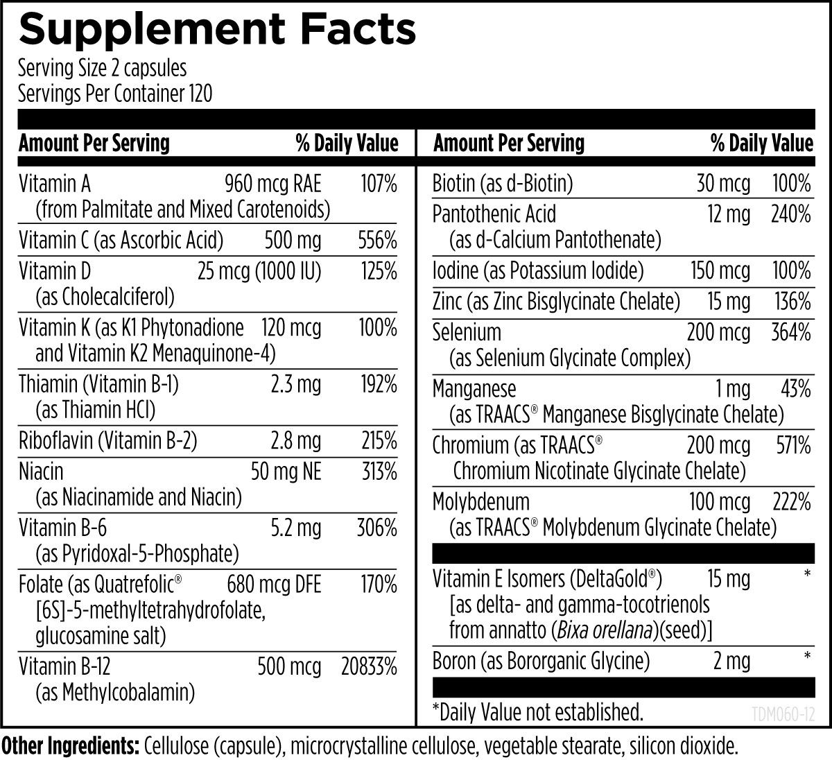 Twice Daily Multi contains optimal amounts of many nutrients not easily obtained in most diets. It uses higher quality ingredients than most multivitamins, including vitamin E Isomers as DeltaGold tocotrienols, a highly bioavailable form of folate, and true amino acid chelate minerals for optimal tolerance and absorption. These exceptional ingredients are combined in an up-to-date, science-based formulation to create a truly superior multivitamin.