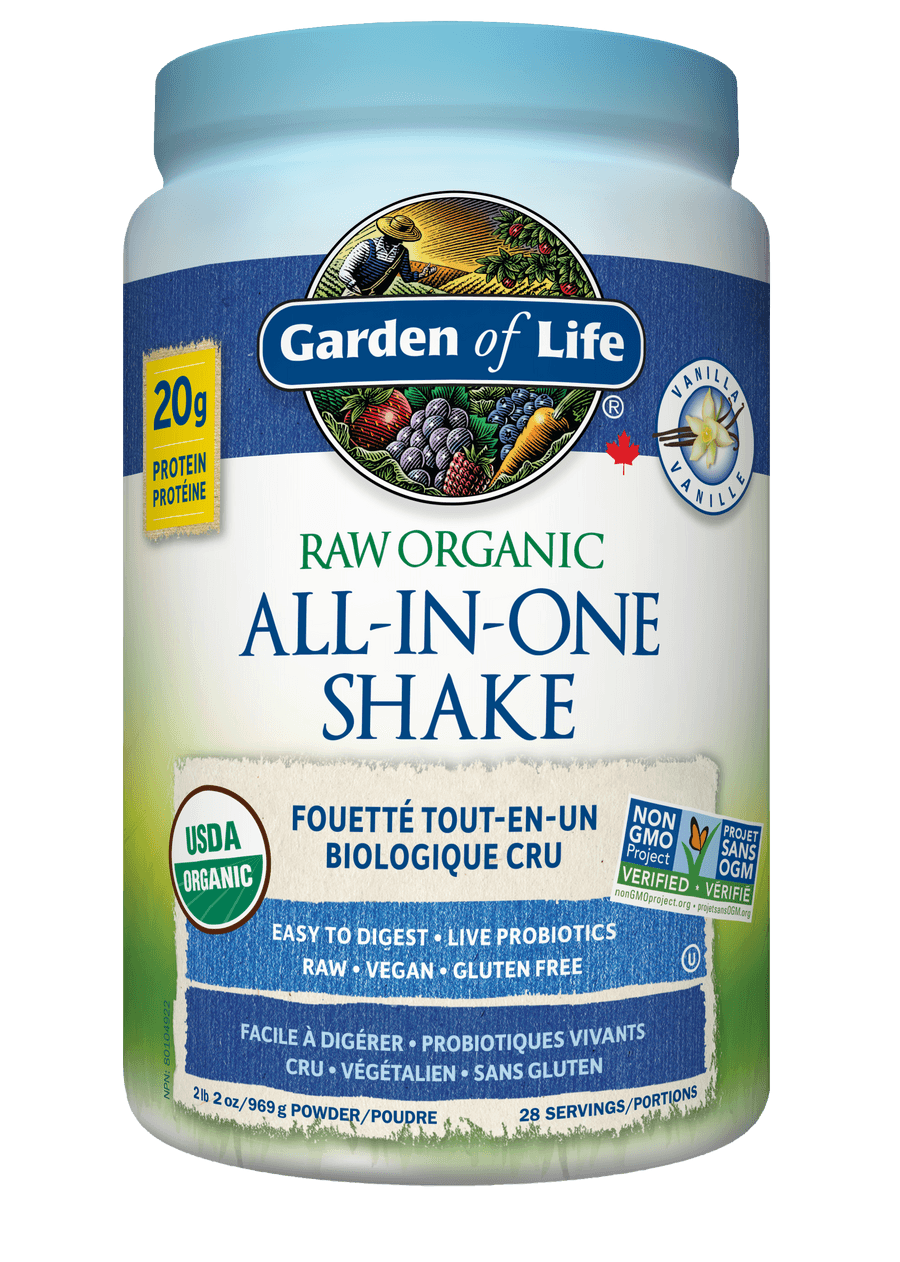 Raw Organic All-In-One is a delicious organic snack-on-the-go packed with incredible nutrition to support your busy lifestyle! This nutritional shake uniquely combines the goodness of multiple Garden of Life products in one, basically fitting the benefits of seven products in its one container! Raw Organic All-In-One delivers 20g of clean protein per scoop from 13 raw sprouted ingredients, along with greens, fiber, probiotics, enzymes, plus 21 vitamins and minerals.