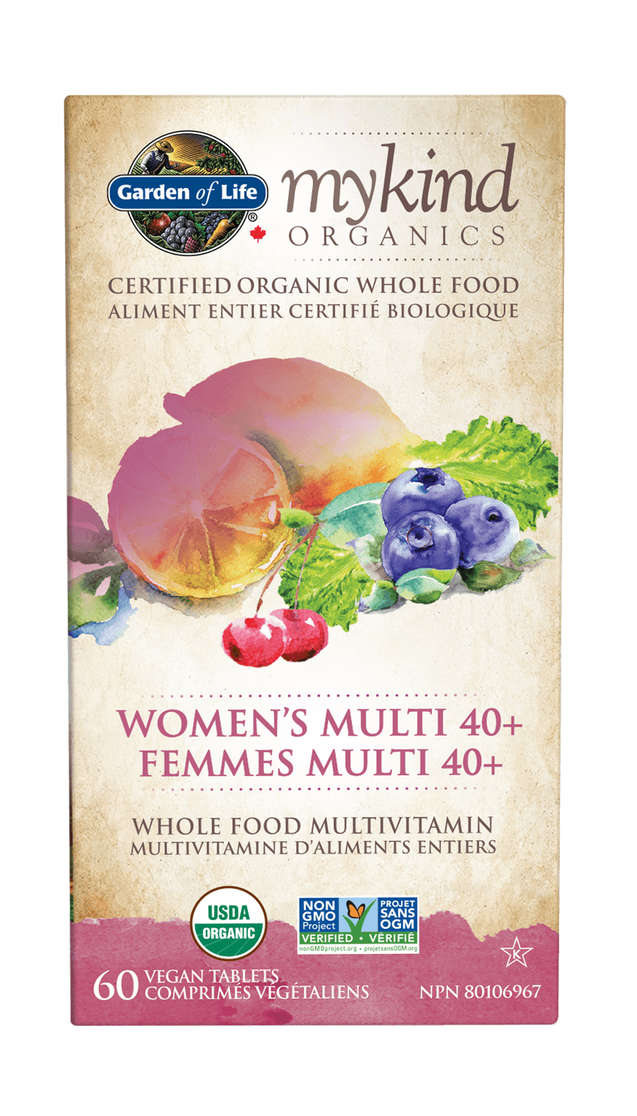 mykind Organics Women’s Multi 40+ is brimming with 20 vitamins and minerals. It also offers organic black cohosh, organic tomato, organic turmeric, plus iodine and selenium.