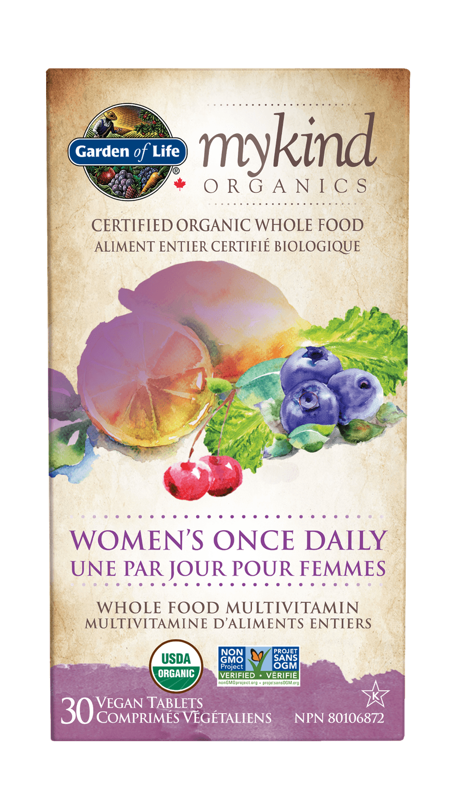 Women’s Once Daily is made from real organic whole food, including lemons, apples, parsley, kale, ginger, tomatoes and many more—providing perfect support for your demanding lifestyle—all in just one organic tablet daily.
