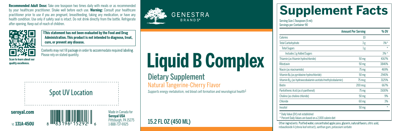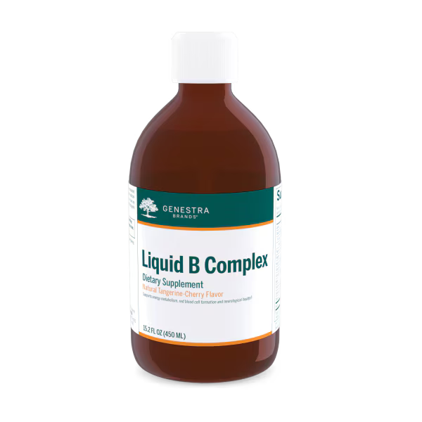 Liquid B Complex is a delicious combination of seven B vitamins, plus choline and inositol. It provides the daily requirements for thiamin, riboflavin, niacinamide, vitamin B6, vitamin B12, biotin and pantothenic acid. B vitamins play an important role in energy metabolism as cofactors for numerous biochemical reactions in the body. Vitamins B6, B12 and riboflavin are particularly critical in the metabolism of the amino acid metabolite homocysteine. Vitamin B12 has an additional role supporting immune system function and is involved in red blood cell formation alongside vitamin B6. In addition, biotin helps maintain cognitive functions as well as healthy hair, nails, mucous membranes and skin. Liquid B Complex also provides choline, a lipotrope that helps support liver function, plus inositol, an important second messenger and component of the phospholipid membrane.
