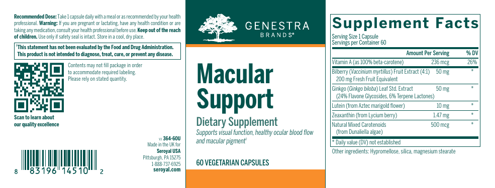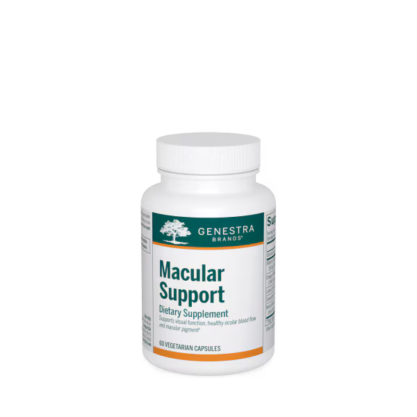 Macular Support promotes eye health using a unique combination of macular pigments and herbal extracts. Lutein and zeaxanthin are naturally-occurring carotenoid pigments that are highly concentrated within the macula. Optimal macular lutein concentrations may help to protect against oxidative stress associated with regular sunlight exposure. In two recent placebo-controlled clinical trials, daily supplementation with 10 mg of lutein for 48 weeks supported a healthy macular pigment optical density in older participants. Ginkgo biloba extracts may provide support for healthy ocular blood flow, and the anthocyanin compounds present in bilberry extracts may help to promote visual acuity.