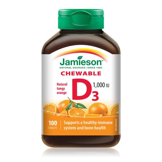 Jamieson Vitamin D3 Chewable 1,000 IU is a delicious way to supplement with Vitamin D3. Vitamin D3 plays a key role in the maintenance of good health while promoting the development of bones and teeth and helping the body effectively absorb calcium. Vitamin D3 also helps support your immune system.