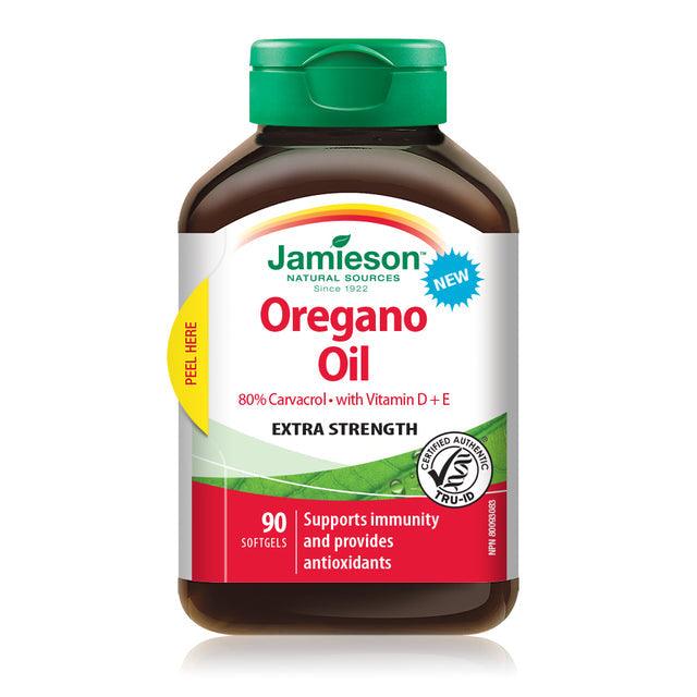 Jamieson Oregano Oil with vitamin D and vitamin E is in an easy-to-take softgel. The formula provides extra strength oregano oil coupled with the powerful antioxidant vitamin E and the benefit of vitamin D to support immunity. Distilled from the leaves of the oregano plant, oregano oil helps fight unwanted bacteria to support a healthy immune system.