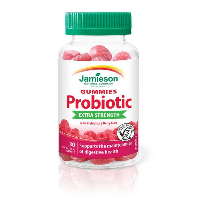 Jamieson Extra Strength Probiotic Gummies with Prebiotics are a delicious way to support your digestive health. These delicious gummies provide 5 billion active cells plus they include chicory root fibre, a source of prebiotic fibre that actively nourishes the probiotics.