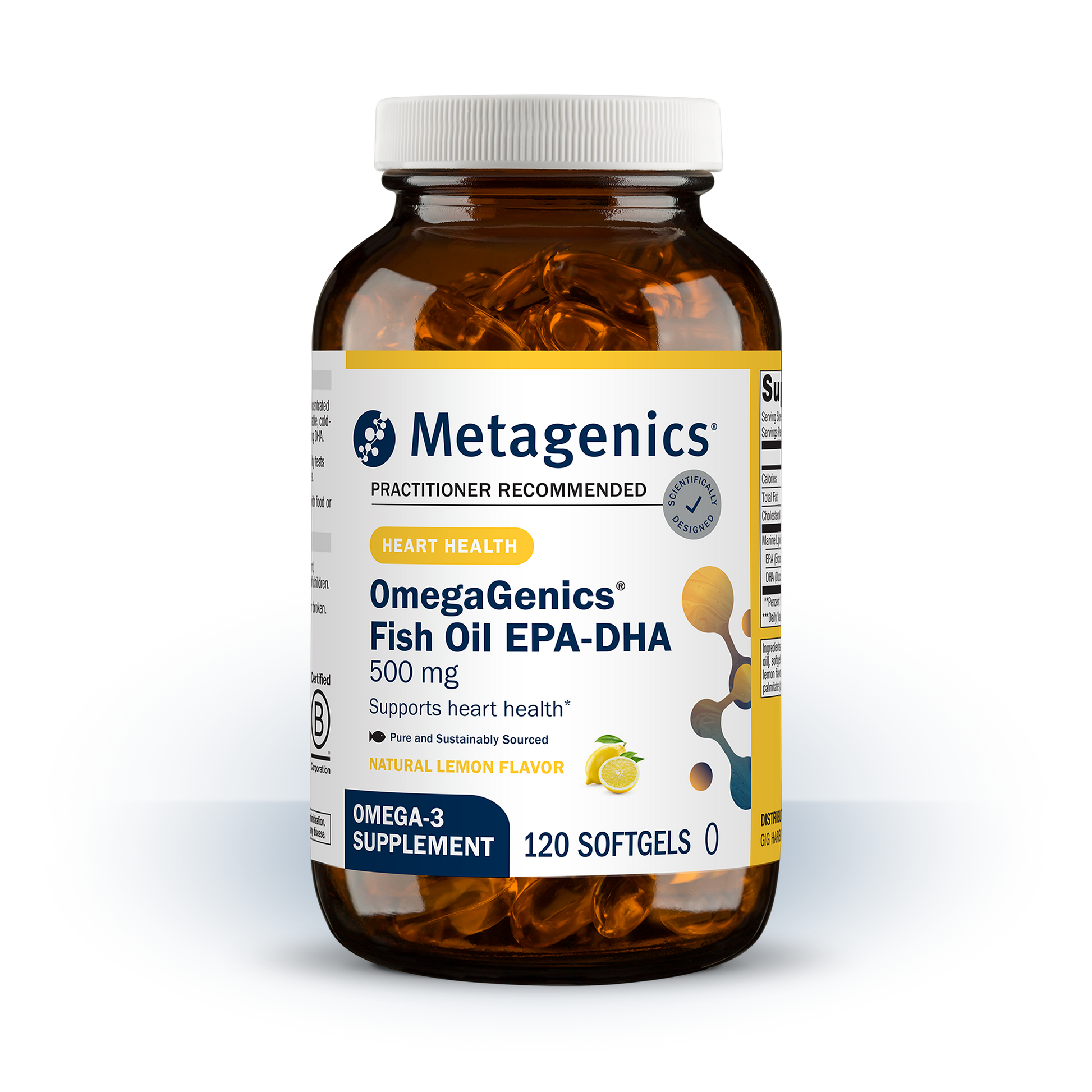 OmegaGenics EPA-DHA 500 mg is a high-quality fish oil that supports heart health. Each serving provides 300 mg of EPA and 200 mg of DHA from naturally sourced 100% wild- caught fish. Rigorously tested for 200 contaminants including heavy metals, enviornmental toxins, & plasticizers from microplastics.