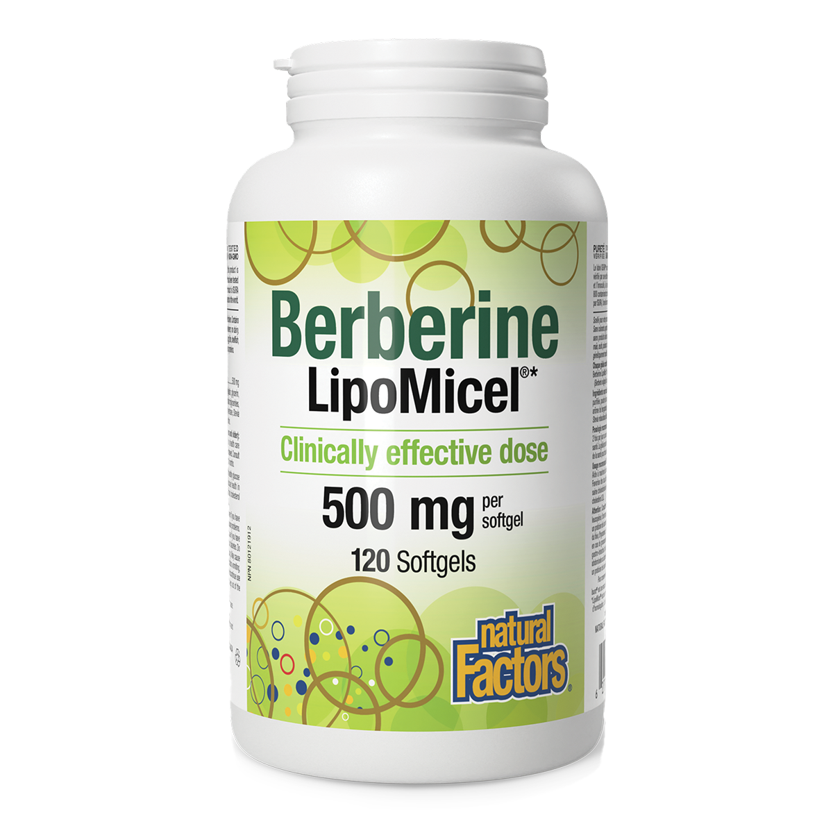 Natural Factors Berberine LipoMicel is a concentrated barberry root extract in a patent-pending LipoMicel formulation. Berberine is a naturally occurring plant compound that Aids healthy blood glucose levels and cardiovascular health in adults. Just two 500 mg softgels per day provide the same effective dose used in clinical studies.
