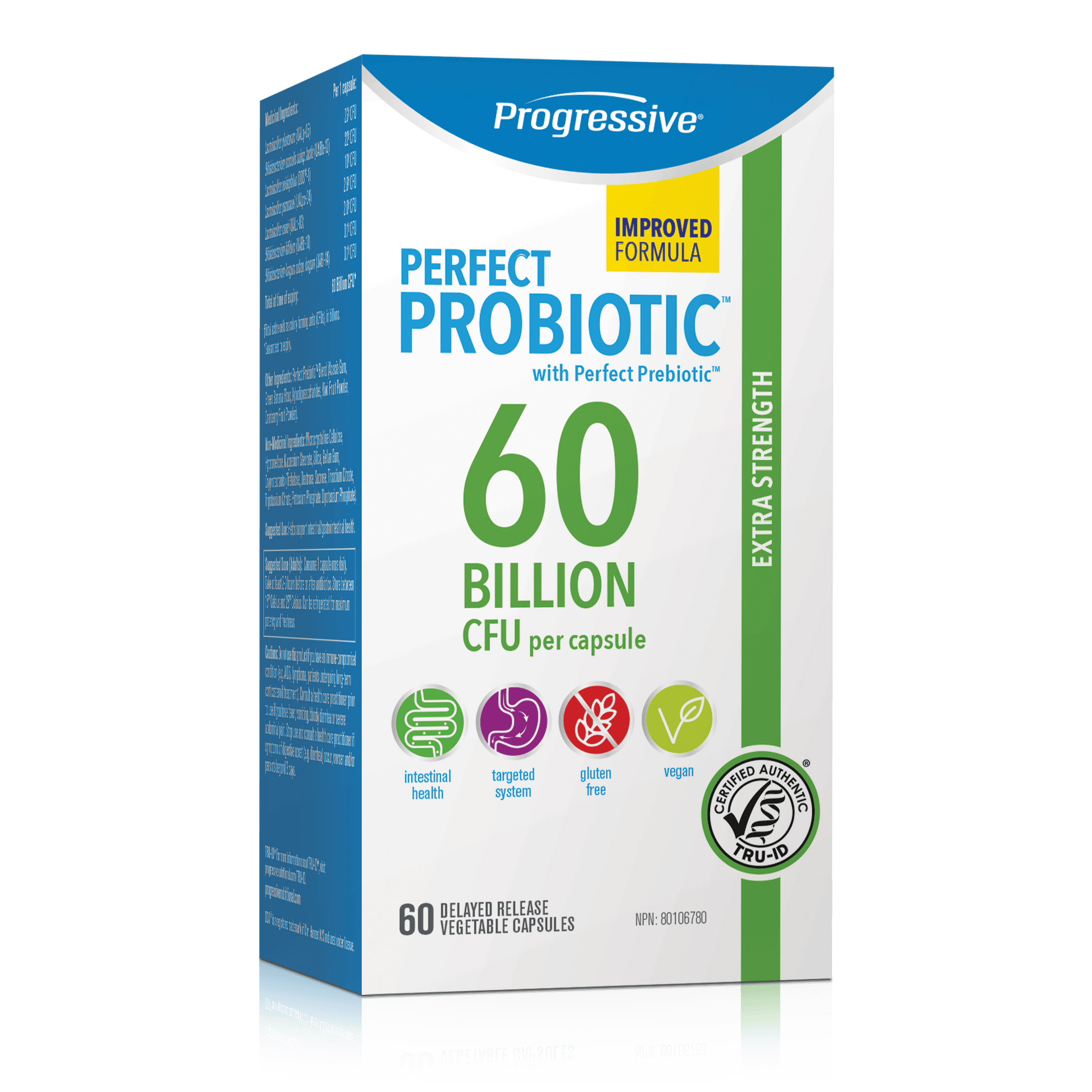 Perfect Probiotic 60 Billion is an extra-strength probiotic for daily use and supports digestive health. Featuring 7 probiotic strains and the Perfect Prebiotic blend to support your entire digestive tract in a delayed-release vegetable capsule. Plus, it's part of the world's first TRU-ID-certified probiotic family; guaranteed to include every species on the label.