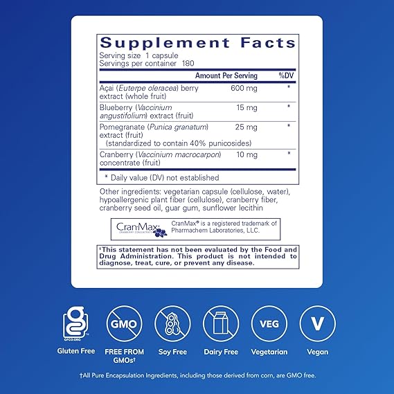 Açai berry extract (Euterpe oleracea), native to Brazil, offers an exceptional nutritional composition of vitamins, minerals, fiber, essential fatty acids, amino acids, and anthocyanins. In this formula, açai is combined with blueberry, pomegranate, cranberry and raspberry for additional antioxidant support.