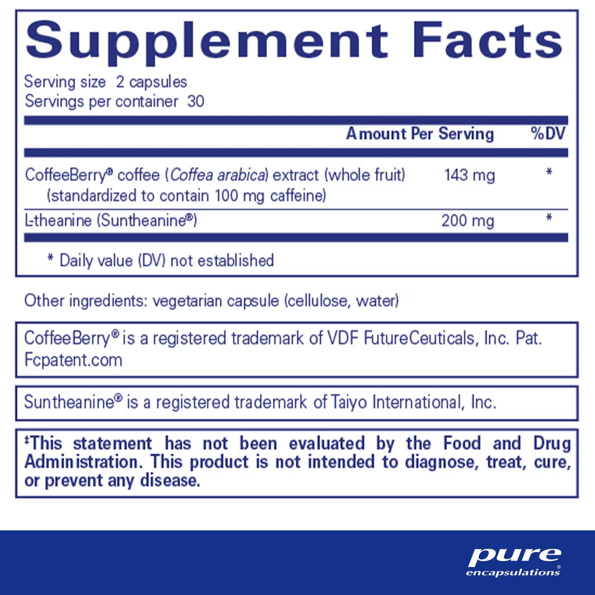 At low to moderate doses, caffeine has been shown to target the central nervous system (CNS) and act as cognitive support, promoting alertness, vigilance, attention, and reaction time. Research indicates that it promotes the encoding of new information and delays fatigue. In a study of 88 young adults, the ingestion of 200 mg caffeine significantly enhanced problem-solving abilities, although it did not alter working memory or creativity. It is believed to exert its effects on the CNS via the adenosine receptors, promoting neurotransmitter release and dopamine concentration, motor unit firing rates, and comfort. In a study of 15 professional e-gamers, 3 mg/kg body weight caffeine promoted accuracy and decreased reaction time. Numerous studies on athletes suggest that caffeine promotes endurance and performance output likely through these same mechanisms. In an incremental exercise-cycling study conducted in recreationally active men, 4 mg/kg body weight caffeine improved time to exhaustion by 12% and significantly decreased perception of effort and subjective fatigue. L-theanine is a component of green tea that promotes normal brain alpha-wave activity, helping calm the sympathetic nervous system for a relaxing effect without drowsiness. It also has been shown to support positive mood and cognitive function, in part by promoting healthy neurotransmitter function and neuroprotection. In combination studies, l-theanine has been reported to moderate some of the effects of caffeine on the CNS, promoting vascular relaxation and local cognitive processing. Coffeeberry is a concentrated whole coffee fruit extract from Coffea arabica containing naturally occurring caffeine and polyphenols. Preliminary research suggests coffee fruit polyphenols support healthy vascular endothelial function and BDNF.