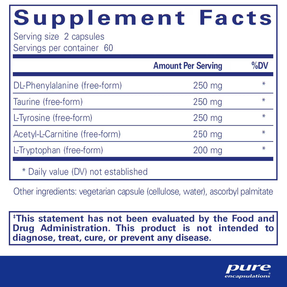 Age-related decreases in levels of several amino acids may influence cognitive function. Amino acids are important intermediates in the production of neurotransmitters in the brain and are involved in neuromodulating activities. L-tyrosine is an amino acid naturally synthesized in the body. It is the precursor of the neurotransmitters L-DOPA, dopamine, norepinephrine and epinephrine, supporting mood and mental clarity. DL-Phenylalanine provides a mixture of two essential amino acids, d-phenylalanine and l-phenylalanine. In the body l-phenylalanine converts to l-tyrosine, enhancing neurotransmitter support. A separate pathway allows both d- and l-phenylalanine to support levels of the mood-elevating compound phenylethylamine, a function not provided by l-tyrosine. The serotonin precursor l-tryptophan is included to support emotional well-being, relaxation and restful sleep. In a double-blind, placebo-controlled study, l-tryptophan supported healthy emotional processing and promoted positive outlook in women. Taurine is considered an inhibitory amino acid, helping to maintain healthy glutamate and other excitatory amino acid activity in the brain. This provides neuroprotective action important for maintaining healthy brain cell function. Acetyl-l-carnitine plays an important role in multiple metabolic and neurotransmitter systems in the brain, supporting memory, attention, mental clarity and mood.