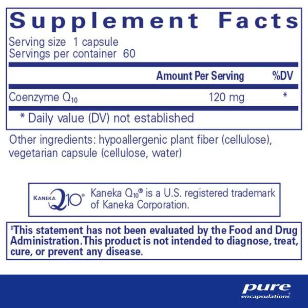 INDICATIONS: Ages 18 and up Cellular energy support SUGGESTED USE: CoQ10 30 mg As a dietary supplement, take 1 capsule, 1-4 times daily, with meals. CoQ10 60 mg, 120 mg, 250 mg, 500 mg As a dietary supplement, 1 capsule, 1-2 times daily, with meals. WARNING:If you are pregnant or lactating, have any health condition or are taking any medication, consult your health professional before use.SOURCE: Pure Encapsulations CoQ10 is obtained naturally by fermentation from microorganisms Hypoallergenic plant fiber is derived from pine cellulose. STORAGE:Store in a cool, dry place.