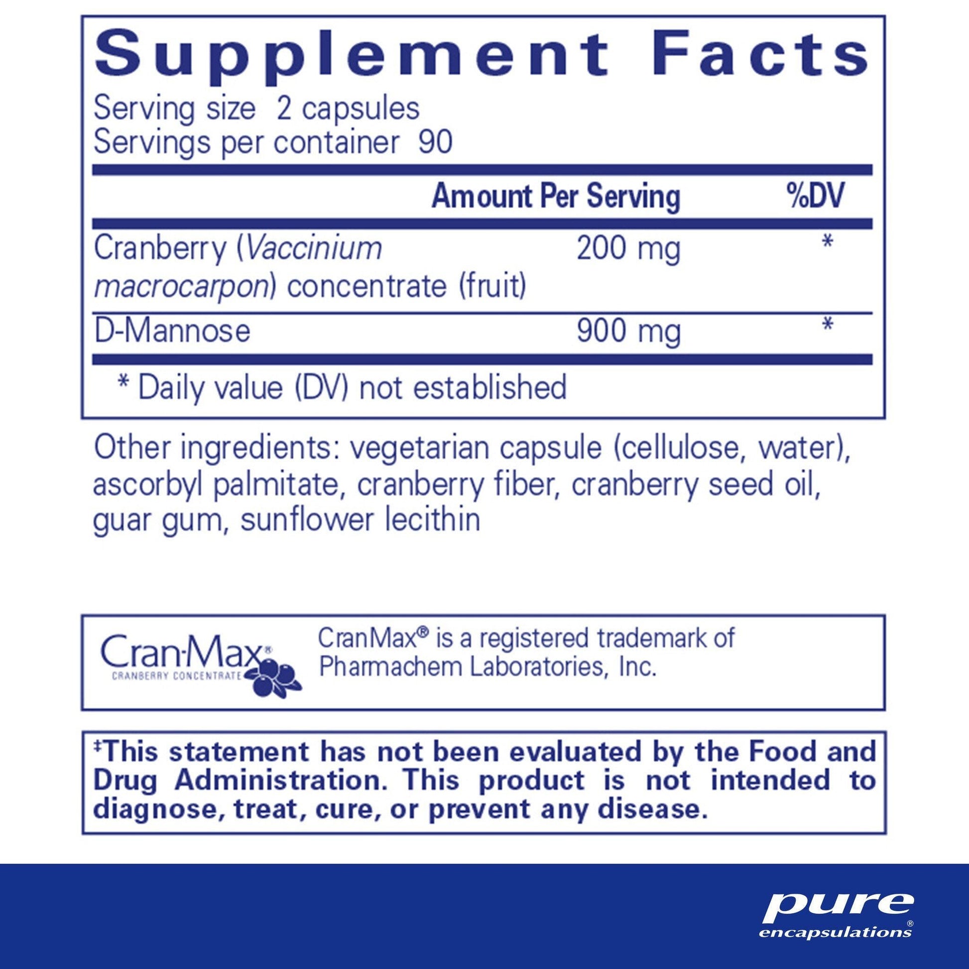 Cranberry concentrate provides urinary tract support without the unwanted sugar found in cranberry juice or juice cocktails. It enhances the acidity of urine and maintains a healthy urinary tract ecology. At Brigham and Women's Hospital in Boston, a randomized double-blind, placebo-controlled trial involving over 150 female volunteers reported positive support for a healthy urinary tract after administration of a cranberry beverage. d-Mannose, a simple sugar found in cranberries and other fruit, is included in this formula to provide enhanced support. One study suggested that dMannose may play a role in supporting healthy genitourinary function by maintaining a healthy mucosal surface.