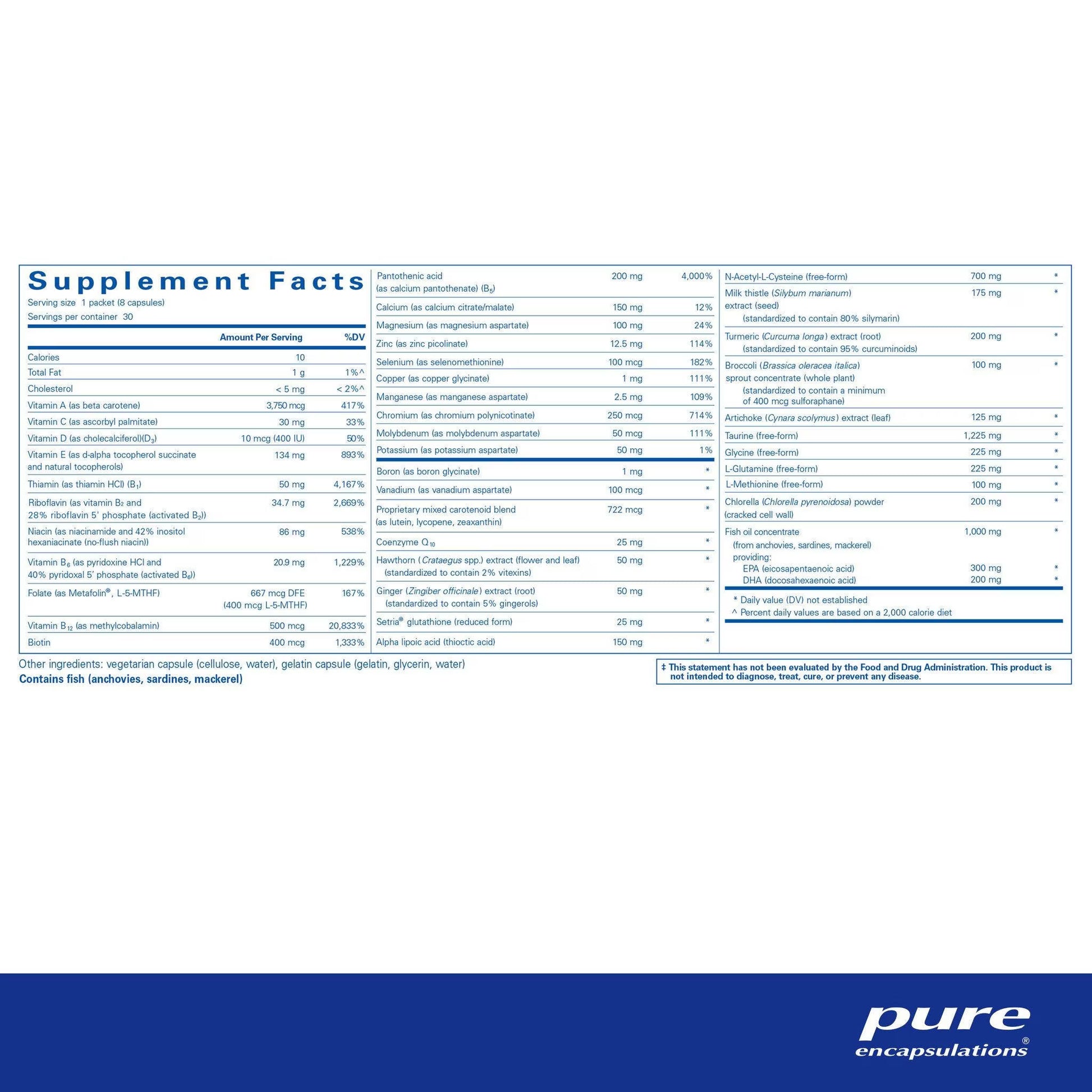 Detox Pure Pack is designed to promote healthy detoxification with a comprehensive profile of bioavailable vitamins, chelated minerals, fish oil, and other ingredients. Activated B vitamins and minerals support phase II detoxification in the liver. Each pack also includes broccoli, curcumin, silymarin and amino acids to further enhance phase II detoxification. Artichoke and taurine promote healthy hepatic fat metabolism and bile flow. Glutathione, NAC, alpha lipoic acid and other antioxidant nutrients are included to maintain liver tissue health, while l-glutamine, omega-3 fatty acids, and chlorella support G.I. cell health and detoxification.