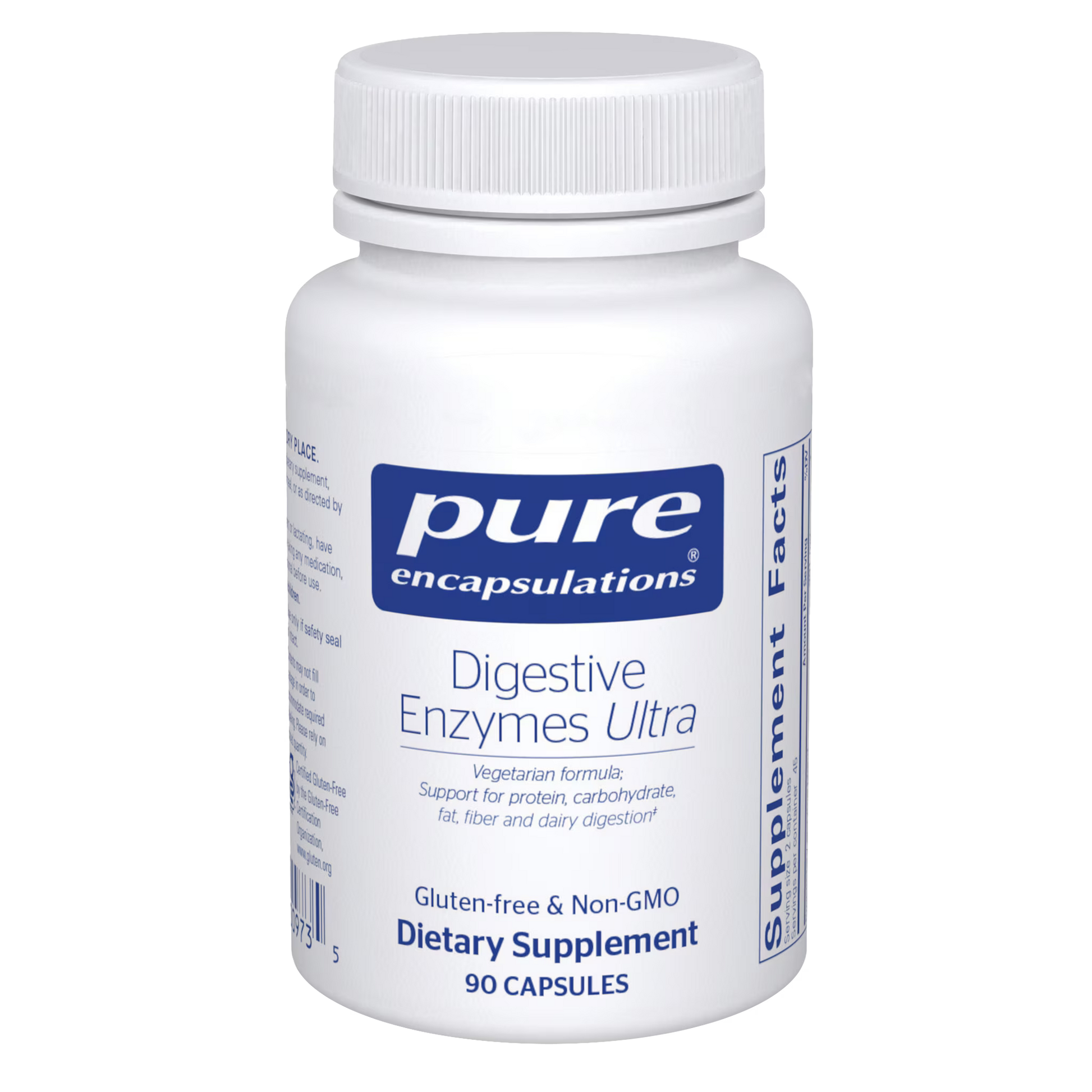 Digestive Enzymes Ultra contains an extensive profile of vegetarian digestive enzymes to support protein, carbohydrate, fat, fiber, and dairy digestion. Proteases included in this formula provide optimal activity across a wide pH range. They facilitate the normal breakdown of proteins and di- and tripeptides. Lipase promotes lipid breakdown while amylase and glucoamylase are included to stimulate polysaccharide breakdown of starch and glycogen. Invertase and lactase support digestion of carbohydrate disaccharides, including the dairy sugar lactose. This formula also offers numerous enzymes to support fiber breakdown, including cellulase, hemicellulase, beta-glucanase and phytase. These enzymes act to break down cell wall components and phytic acid, promoting nutrient bioavailability of fiber-containing foods. Additionally, alpha-galactosidase promotes the breakdown of certain complex carbohydrates, such as raffinose and stachyose, found in some legumes, vegetables, and grains helping to relieve occasional bloating or gas.