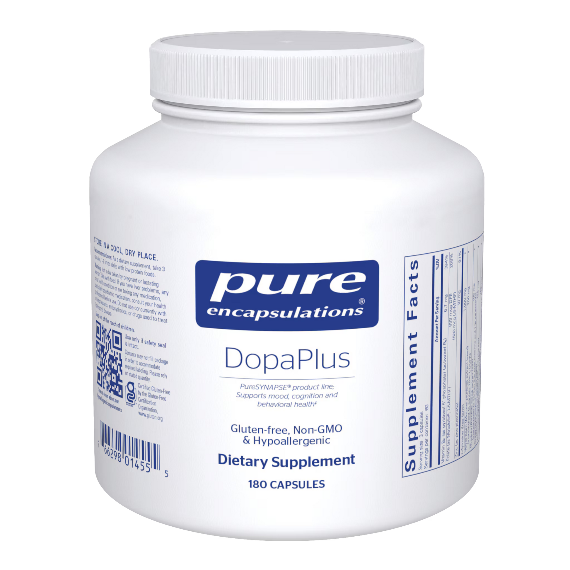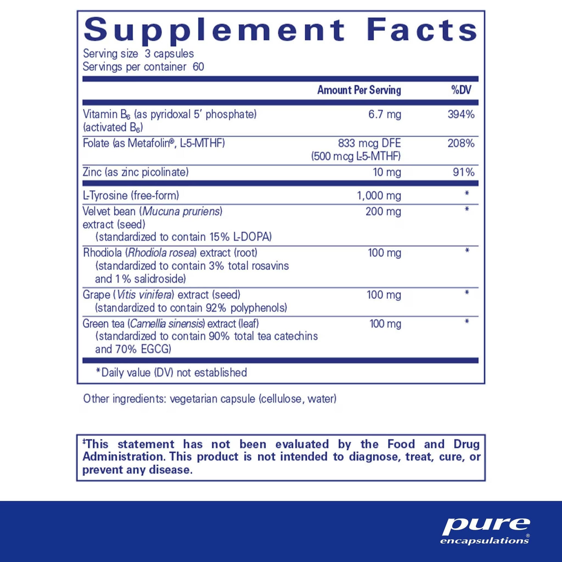 DopaPlus promotes the production of dopamine to support daily cognitive function and performance on mental tasks. This formula provides the dopamine precursors L-tyrosine and L-DOPA (from Mucuna pruriens). In a randomized, controlled, double-blind, crossover trial, Mucuna pruriens supplementation promoted L-DOPA plasma concentrations. The cofactors vitamin B6 , folate (as Metafolin L-5-MTHF) and zinc support dopamine production. Studies show that supporting optimal serum levels of these nutrients promote positive mood. Rhodiola and green tea polyphenols promote the stability of dopamine and maintain healthy dopamine reuptake. Grape seed proanthocyanidins support cognitive function and mental sharpness. Green tea and grape seed polyphenols help to maintain neuronal health and function.