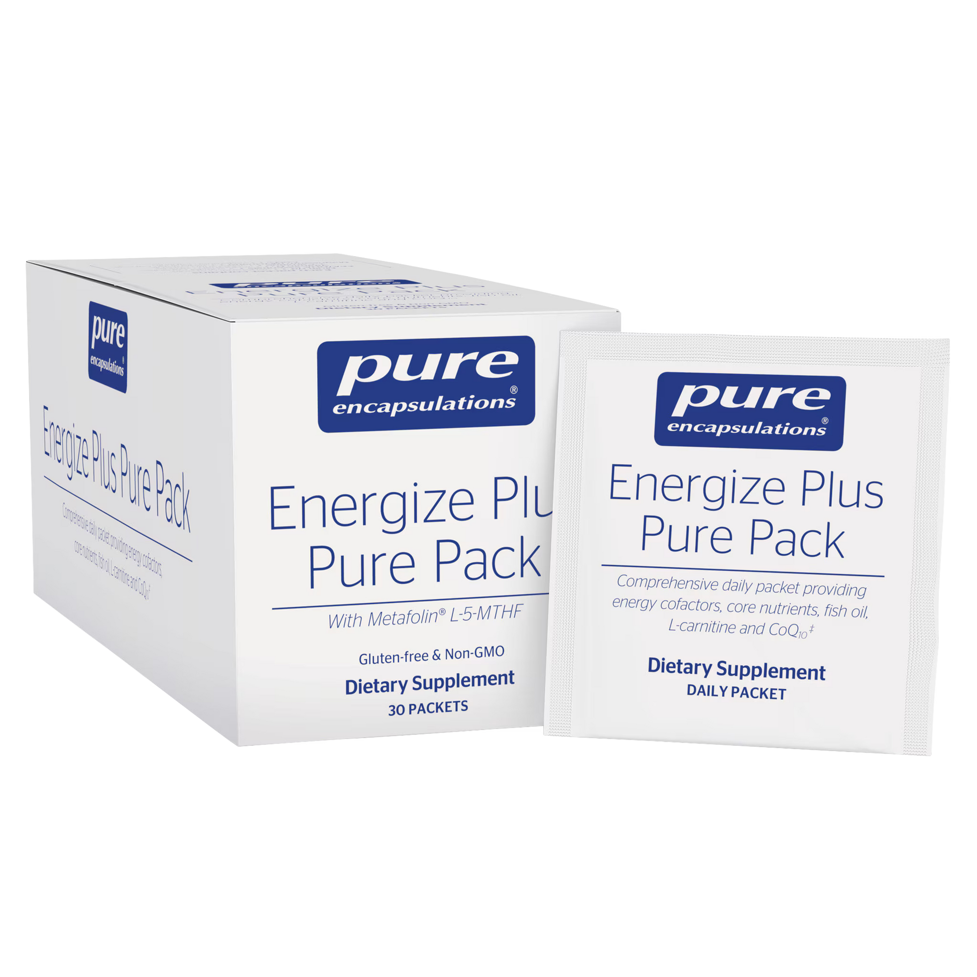 Energize Plus Pure Pack is designed to promote nutrient metabolism and healthy weight management, and enhance energy production in the mitochondria with a comprehensive profile of bioavailable vitamins, chelated minerals, fish oil, and other ingredients. B vitamins, CoQ10 and magnesium act as cofactors in the energy production pathway. L-Carnitine shuttles fatty acids into the mitochondria for oxidation and conversion into energy. Omega-3-fatty acids support healthy gene expression to enhance glucose and lipid homeostasis. Vitamin D promotes healthy nutrient metabolism. Magnesium and B vitamins also help to maintain a healthy response to stress.
