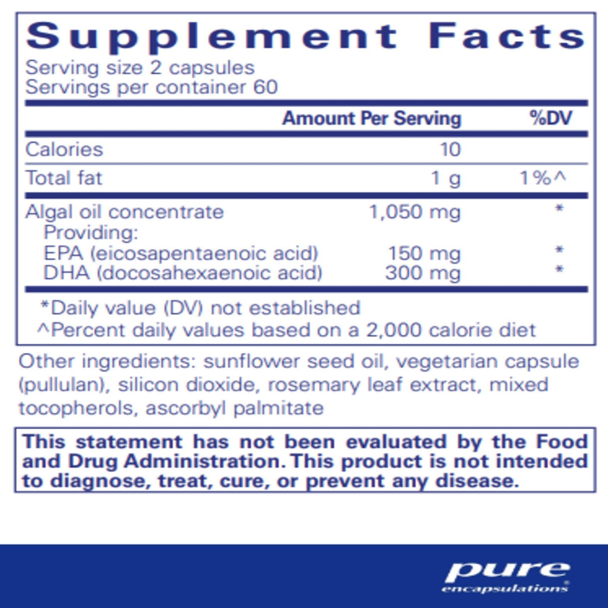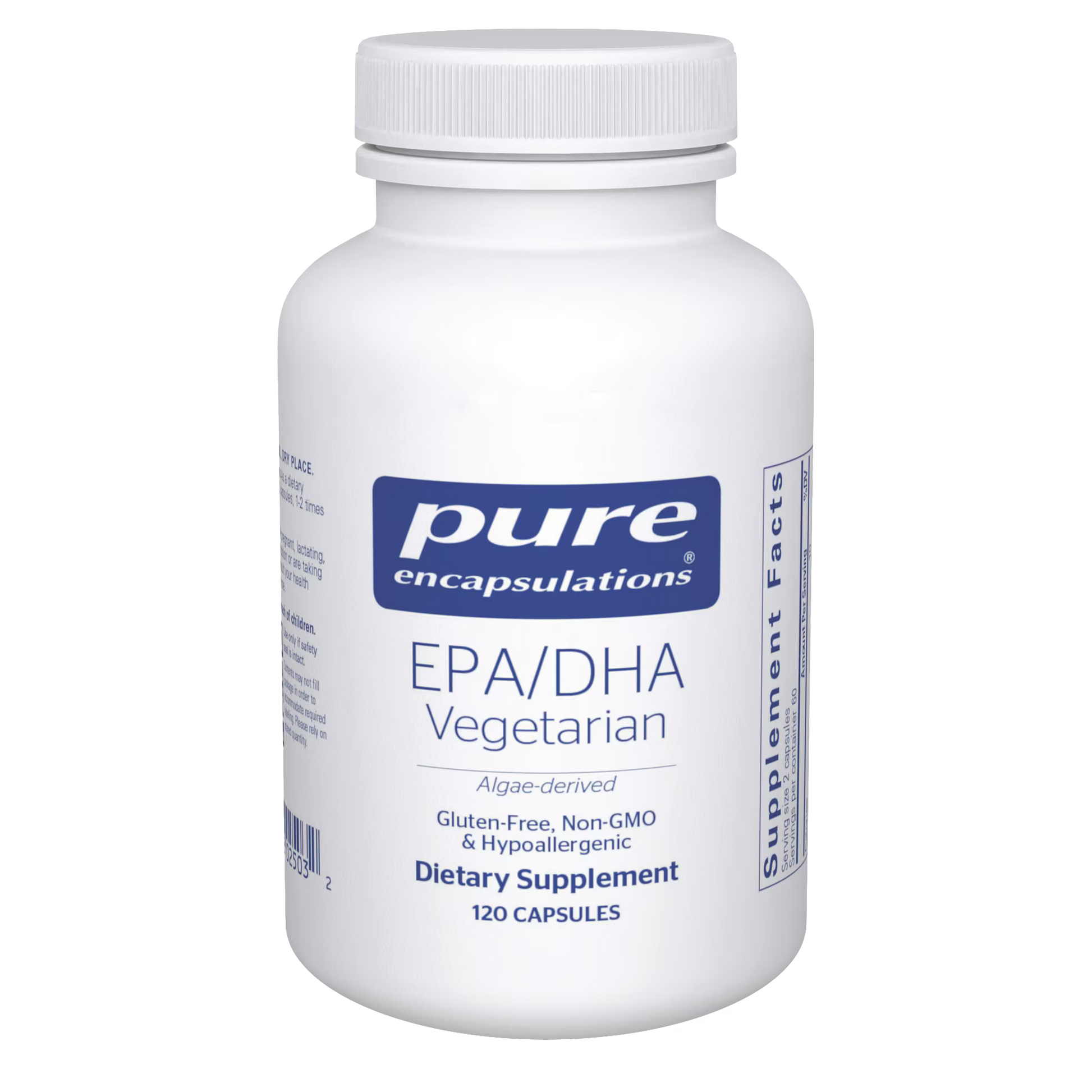 This formula contains vegetarian EPA and DHA derived from the marine algae, Schizochytrium sp., offered in a vegetarian capsule. Omega-3 essential fatty acids EPA and DHA are both important for various functions throughout the body. Research indicates that higher plasma levels of EPA and DHA are associated with cardiovascular health, platelet function, joint comfort and cognitive health. Typical vegetarian sources of omega-3 include leafy vegetables, soybeans and flaxseed, however, these foods provide α-linoleic acid (ALA) with an inefficient conversion to EPA and DHA at 10% or less. Pure Encapsulations EPA/DHA vegetarian provides pre-formed EPA and DHA that do not require conversion for utilization.