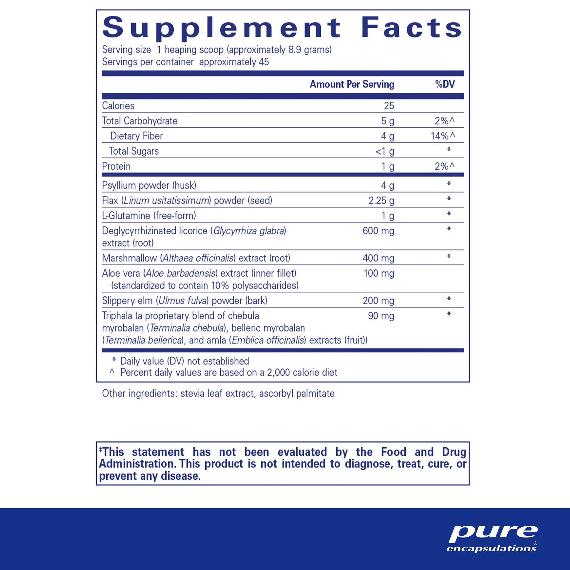 This product is a blend of high-impact fiber, herbs and nutrients, supporting overall gastrointestinal function and occasional constipation. Psyllium is a valued source of soluble fiber, helping to promote larger and softer stools for healthy bowel movement frequency. It is fermented in the intestines, producing short chain fatty acids (SCFAs) that provide an energy source for the colon to maintain healthy colon cell function and promote beneficial microflora. Flaxseed provides a source of lignans, fatty acids, and both soluble and insoluble fibers, enhancing the gut health potential of this complex. In times of stress or increased metabolic demand, glutamine is an especially important source of energy for the G.I. tract. It also maintains the integrity of the intestinal barrier. G.I. Fortify‡ provides a combination of deglycyrrhizinated licorice (DGL), aloe, slippery elm and marshmallow root to support gut integrity and provide a soothing effect. Triphala is a standardized blend of three fruit extracts, Terminalia chebula, Terminalia belerica and Emblica officinalis. It is an Ayurvedic blend prized for supporting intestinal detoxification, occasional constipation and overall colon health.