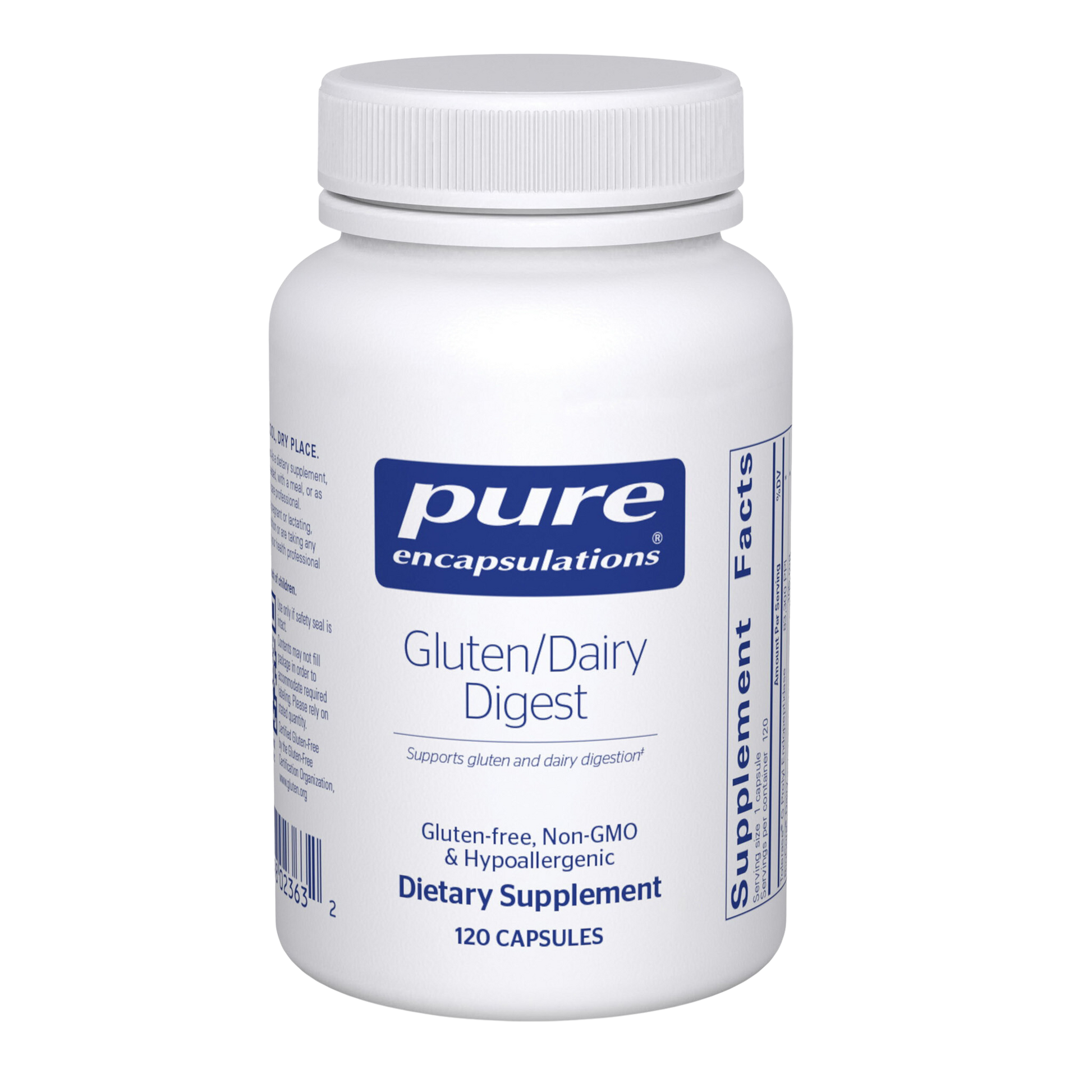Gluten/Dairy Digest contains a blend of digestive enzymes targeting gluten and dairy digestion. It provides a blend of proteases specially formulated to help break down gluten peptide fragments in normal digestive systems. Studies suggest that it may also promote a healthy cytokine balance to support G.I. comfort and function. Additionally, this formula provides a unique mixture of protease enzymes and lactase to assist digestion of multiple constituents of milk and dairy products. Protease enzymes targeting casein and beta-lactoglobulin proteins support dairy protein digestion. Casein is the predominant protein in milk and cheese, while beta-lactoglobulin occurs primarily in the whey fraction of milk. Beta-lactoglobulin is an acid-stable protein and therefore may not be broken down by pepsin and pancreatin. Lactase breaks down the milk sugar lactose, helping to relieve occasional bloating or gas that some people can experience from dairy consumption. If you are on a controlled diet and/or under the care of a health professional for dairy and/or gluten digestion, continue to follow those recommendations. This product is not intended to substitute for the recommendations of a health professional.
