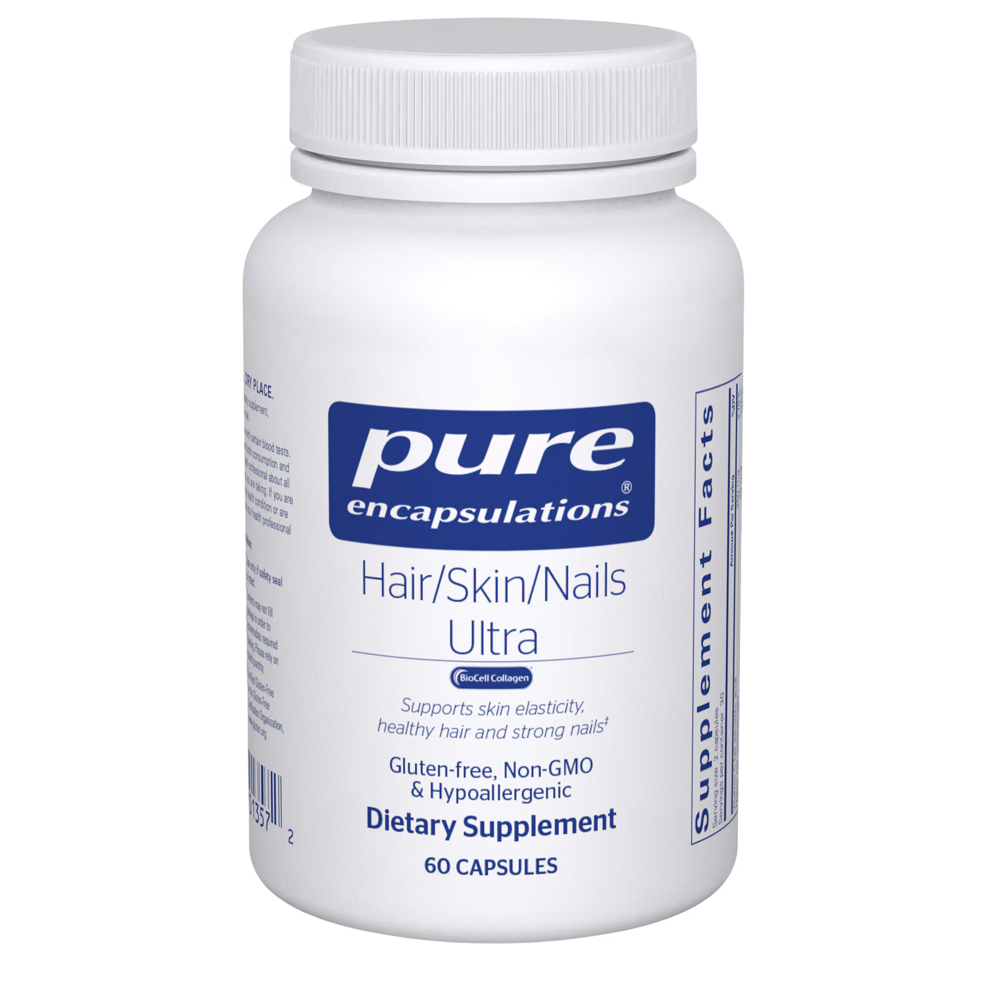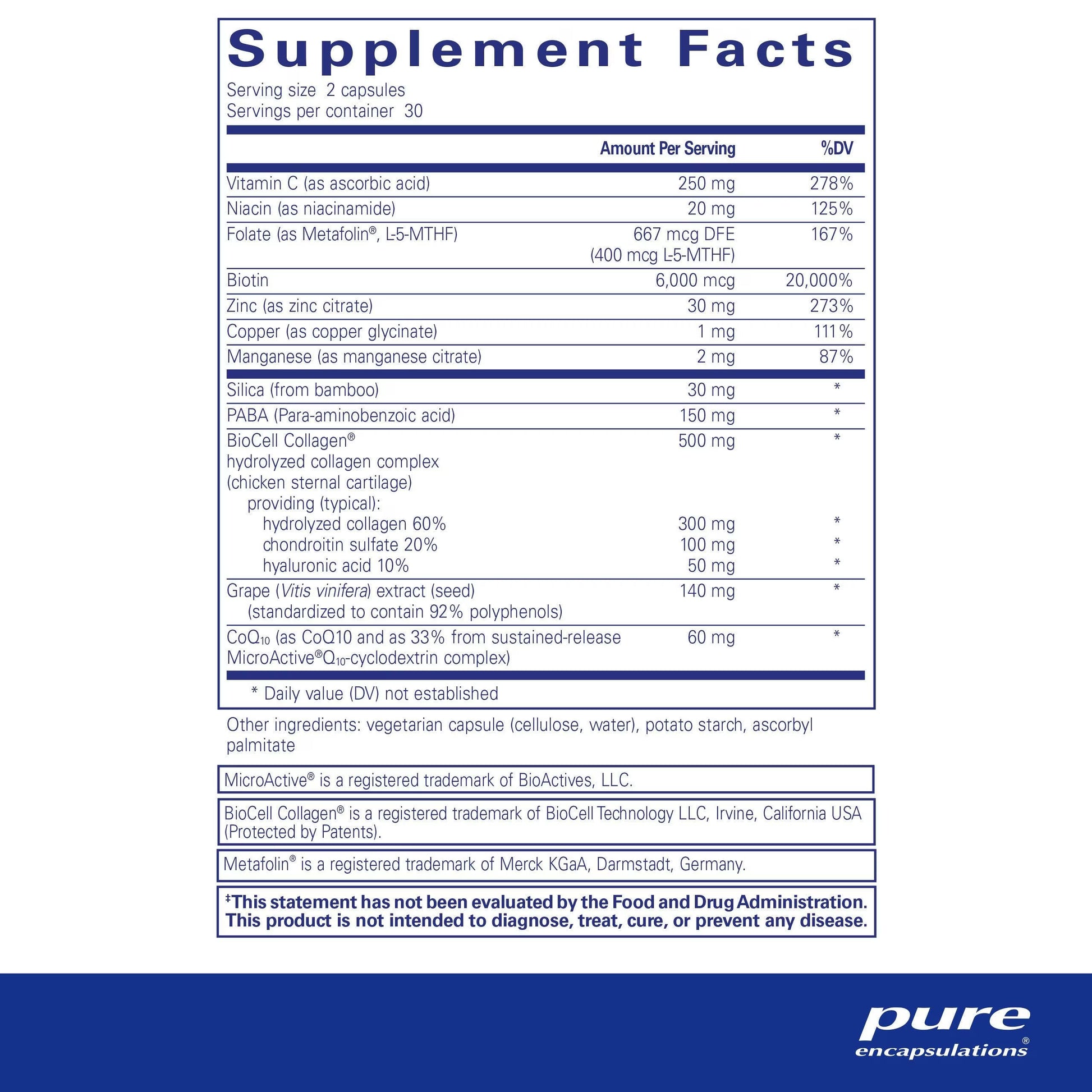 Vitamin C, zinc, copper, manganese and silica are integral cofactors for collagen and keratin synthesis, promoting skin elasticity. Optimal levels of these nutrients, as well as folate, have been associated with healthy hair, skin and nails. Vitamin C supports skin resiliency and helps counter the effects of oxidative stress. Coenzyme Q10 also provides antioxidant support. Niacinamide and zinc promote immune function in the skin. The proanthocyanidins in grape seed extract help to stabilize collagen and elastin by moderating the proteolytic enzymes collagenase and elastase. Clinical studies indicate that biotin may help reinforce the keratin structure of the nails, promoting strength and thickness. PABA supports the appearance of healthy hair through its effects on melanin metabolism. BioCell Collagen is a patented, hydrolyzed and denatured low molecular weight collagen, providing a naturally occurring matrix of hyaluronic acid (HA), chondroitin sulfate and amino acids including lysine, proline and hydroxyproline. These structural components support the elasticity and firmness of skin. Furthermore, HA attracts water, promoting hydration and moisture retention within the dermal matrix. Case reports have revealed that BioCell Collagen helped moderate the appearance of wrinkles and blemishes in the skin.