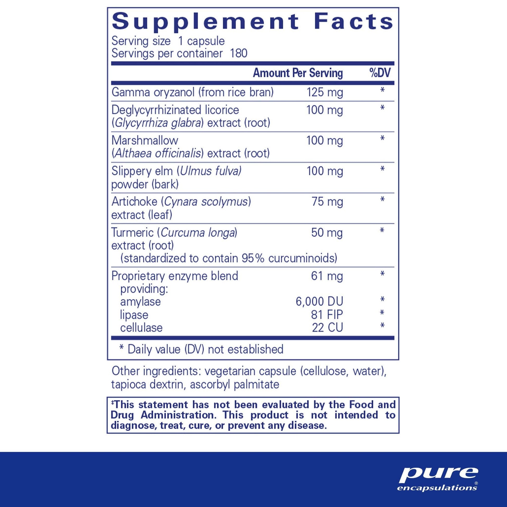 Gamma oryzanol has a history of use for supporting the health of the stomach lining. Its mechanism has yet to be clarified, but may involve the autonomic nervous system, which regulates gastric secretory activity. DGL, marshmallow and slippery elm are traditionally recognized for their value in soothing the gastrointestinal tract and maintaining the integrity of the mucosal lining. Artichoke helps to stimulate the digestive process. Plant enzymes further promote the digestive process by assisting in the breakdown of proteins, fats and carbohydrates.