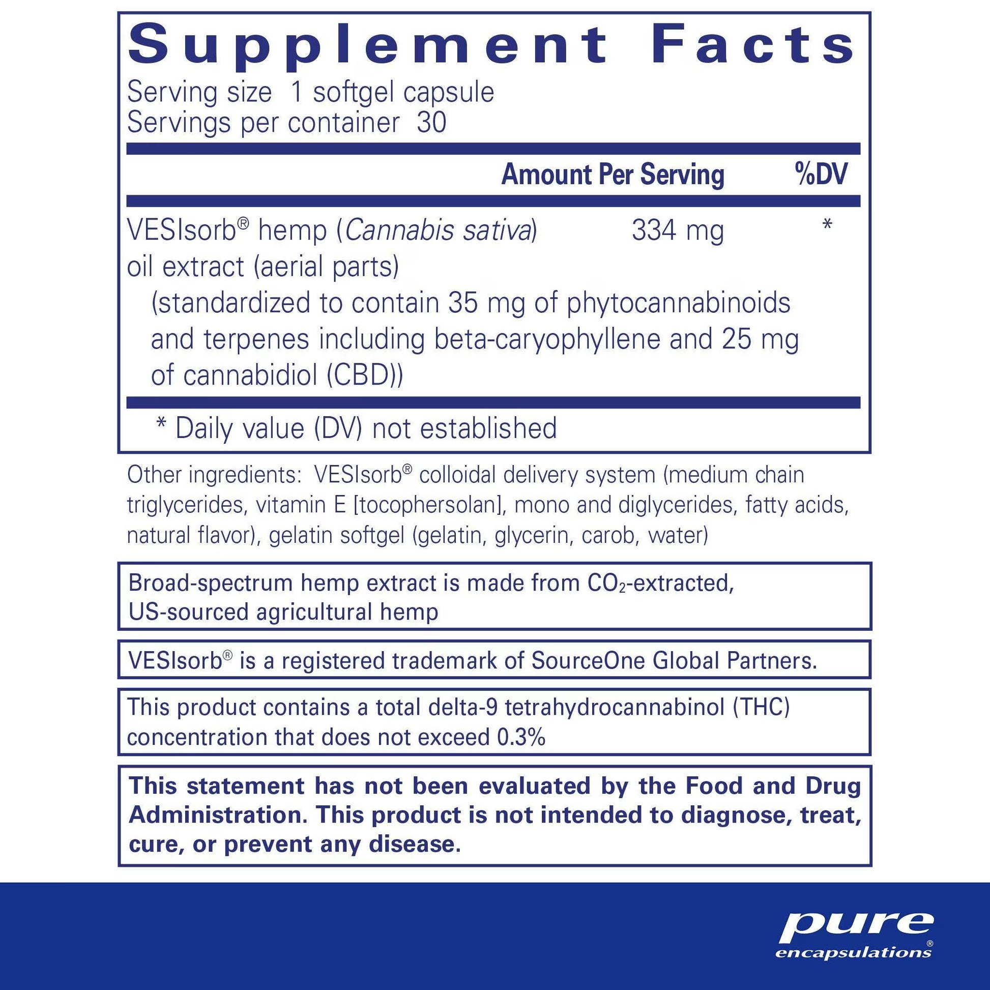 - Enhanced-bioavailability VESIsorb technology offers a unique, self-assembling colloidal system to enhance absorption by promoting the ability of the hemp extract to dissolve readily in an aqueous environment