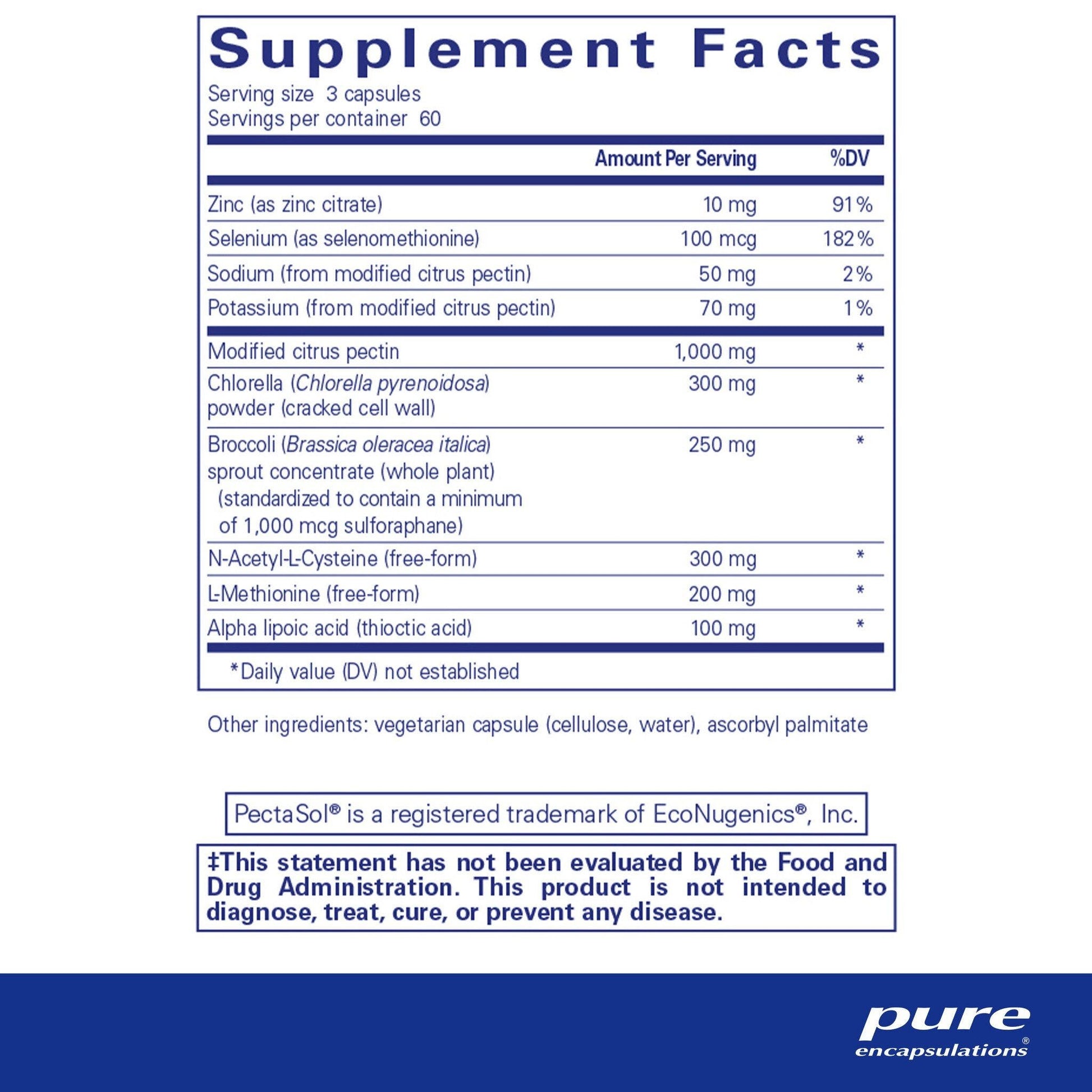 The unique characteristic of PectaSol-C modified citrus pectin, versus other pectins, is its low molecular weight. A low molecular weight allows it to pass through the intestinal barrier and work systemically where it has the potential to bind to low levels of heavy metals from common, mild environmental exposure and facilitates their excretion. Modified citrus pectin does not appear to alter excretion of other minerals, including calcium, magnesium and zinc. Chlorella has a long history of traditional use in supporting the body's natural detoxification process, particularly helping to regulate common heavy metal exposure and distribution in tissues. Sulforaphane, from broccoli sprout concentrate, promotes Nrf2-mediated signaling. Nrf2 controls the expression of numerous genes responsible for detoxification and protection against oxidative stress. As part of a cysteine-rich metal-binding protein, zinc exhibits similar properties. In addition, NAC provides important support for detoxification by maintaining glutathione concentrations. l-Methionine also plays a rolein glutathione production and phase II detoxification pathways in the liver. Preclinical studies suggest that alpha lipoic acid may help to moderate heavy metal induced oxidative stress.