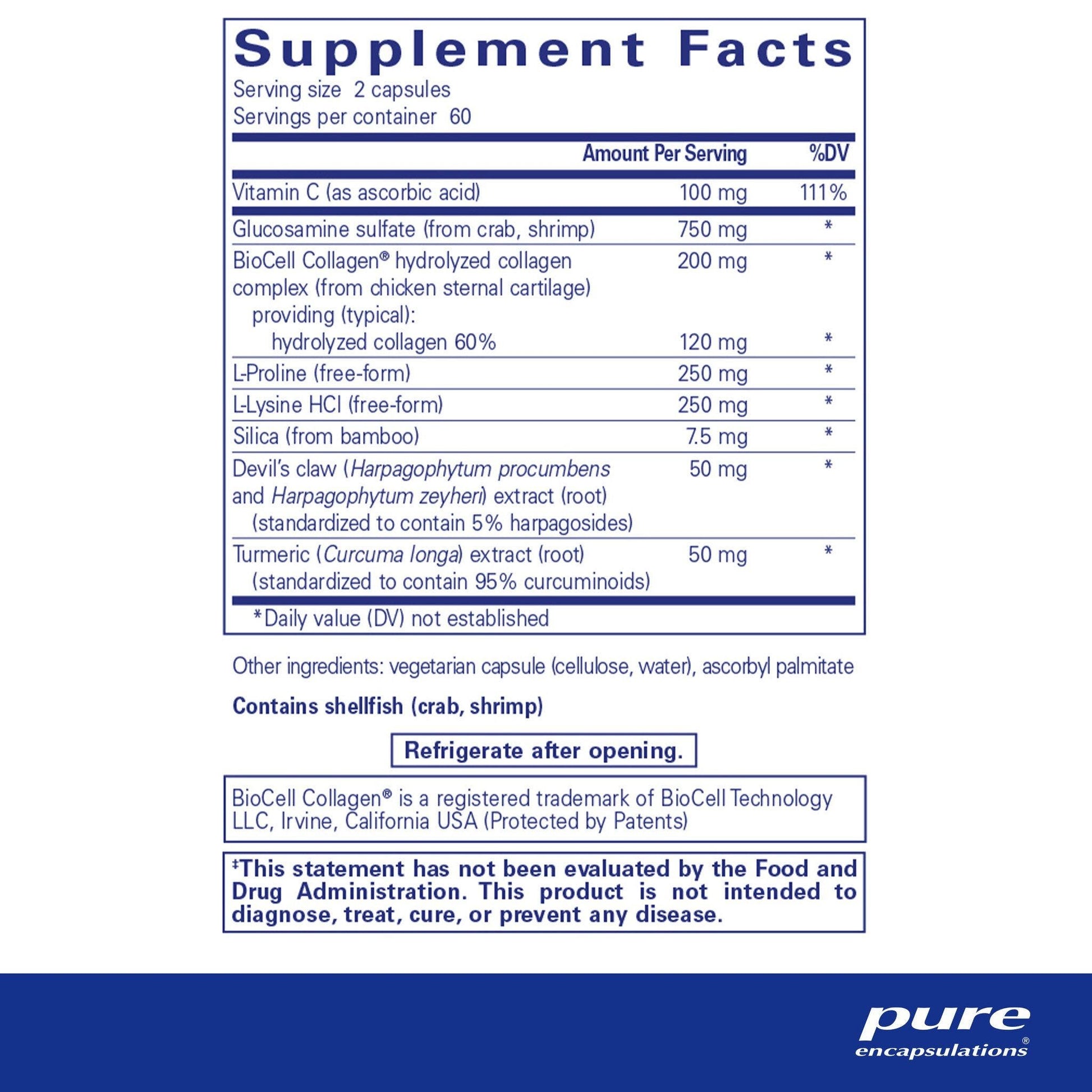 Glucosamine is required for the synthesis of proteoglycans, the molecules responsible for providing tendons, ligaments, and cartilage their resiliency and strength. It also helps protect cartilage from the effects of mechanical stress. Sulfate, another component of proteoglycans, works synergistically with glucosamine to enhance cartilage repair and regeneration. BioCell Collagen provides hydrolyzed and denatured low molecular weight collagen. Additionally, it provides a naturally occurring blend of hyaluronic acid (HA), chondroitin sulfate, glucosamine sulfate and amino acids to promote cartilage synthesis and joint integrity. A double-blind, placebo-controlled study involving 16 individuals supplementing with BioCell Collagen for eight weeks indicated statistically significant support for joint function and comfort. To further encourage collagen formation, this formula is enhanced with l-lysine and l-proline. These amino acids are hydroxylated to form hydroxyproline and hydroxylysine in a reaction involving vitamin C, forming the "glue" that holds collagen together. In the body, silica is found primarily in connective tissue and plays a role in collagen tissue formation. Devil's claw and curcumin are included to support joint flexibility, function and comfort, in part by maintaining healthy eicosanoid metabolism.