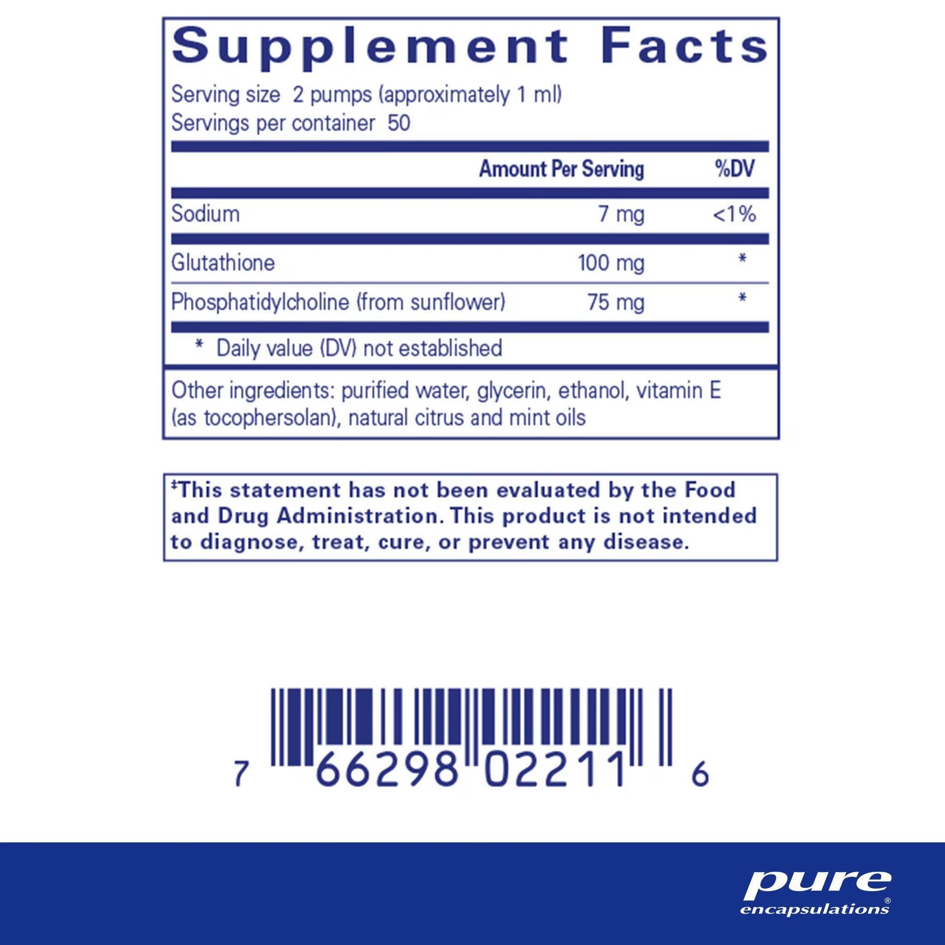 Liposomal Glutathione liquid offers the antioxidant glutathione in an enhanced-absorption liposomal form to target cellular health and function. Glutathione is a large molecule composed of glutamine, cysteine and glycine. It is found in virtually every cell of the body and plays a critical role in protein synthesis, enzyme function and transport, and cell maturation. It is also one of the main endogenous antioxidants, acting to recycle other antioxidants and protect the body from free radicals. Optimal levels of glutathione have been associated with physical and mental health, and the liposomal form helps to protect the glutathione bonds from degradation that can occur in digestion. This liposomal liquid delivery system utilizes phosphatidylcholine from non-GMO sunflower oil and tight manufacturing control to ensure glutathione encapsulation for optimal performance. The controlled processing procedure results in very small, highly stable spherical liposomes. These small liposomes allow for increased absorption and diffusion across mucus membranes.