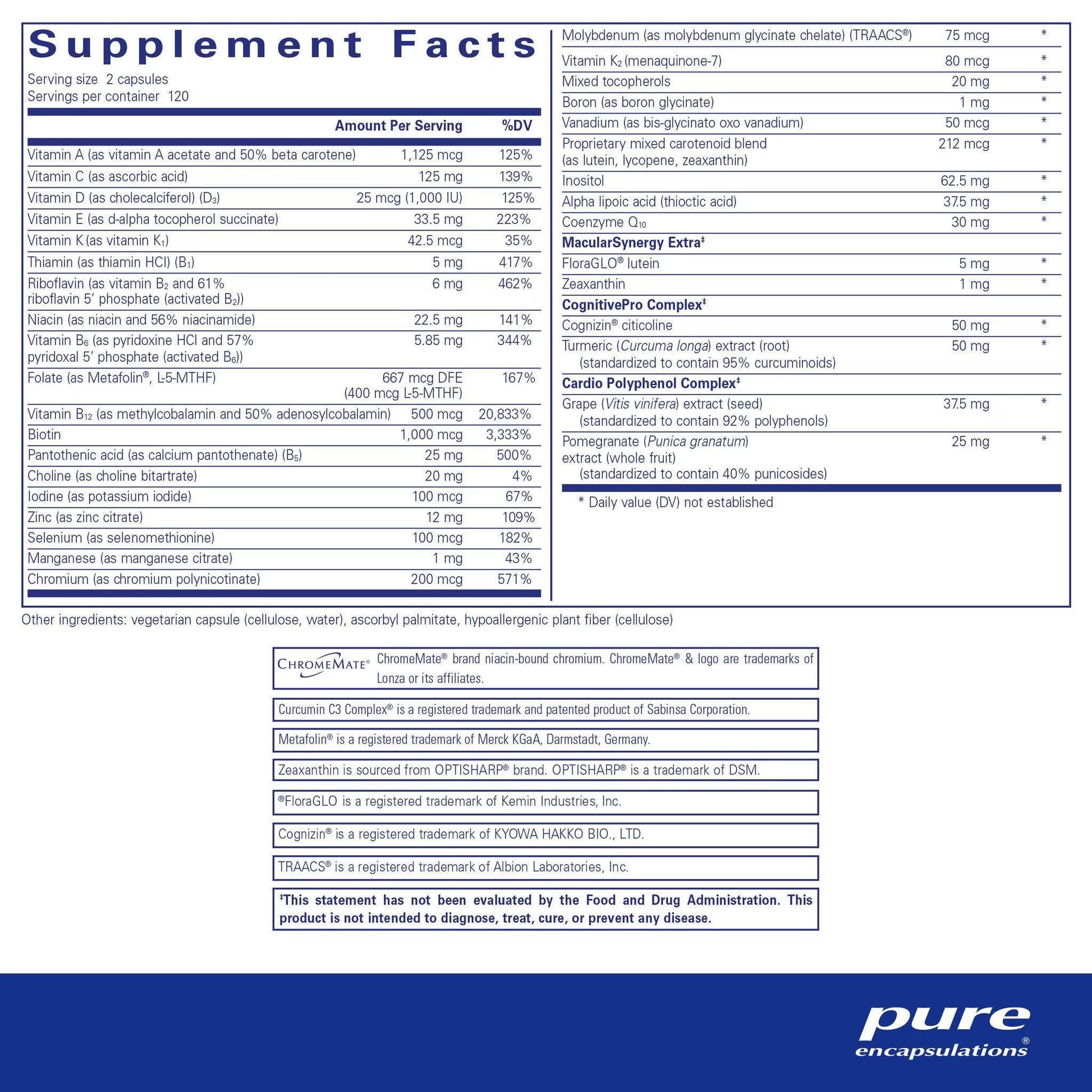 The formula combines essential vitamins, minerals and antioxidants to support optimal health. Vitamins K1 , K2 and vitamin D3 support cellular, bone and heart health. Enhanced levels of ChromeMate chromium polynicotinate and biotin for metabolic support. Promotes cellular energy production with adenosylcobalamin and CoQ10. Folic acid provided as Metafolin , 5-methyltetrahydrofolate (L-5-MTHF), the naturally occurring universally metabolized form of folate. Adenosylcobalamin is the form of vitamin B12 active in mitochondria, boosting mitochondrial energy (ATP) production. Animal studies suggest it specifically enhances mitochondrial bioenergetics, promotes type IIA fast twitch muscle fiber size during aging and stabilizes neuro-muscular junctions. Cognizin citicoline promotes choline and phospholipid composition in the brain, essential for neuronal communication and protection, as well as daily mental task performance. Provides targeted support for healthy brain cell function with Curcumin C3 Complex. Maintains healthy blood vessel function with polyphenols from pomegranate and grape seed extract. Offers advanced macular and retinal protection with lutein, zeaxanthin and synergistic cofactors vitamin C, vitamin E, zinc and carotenoids.