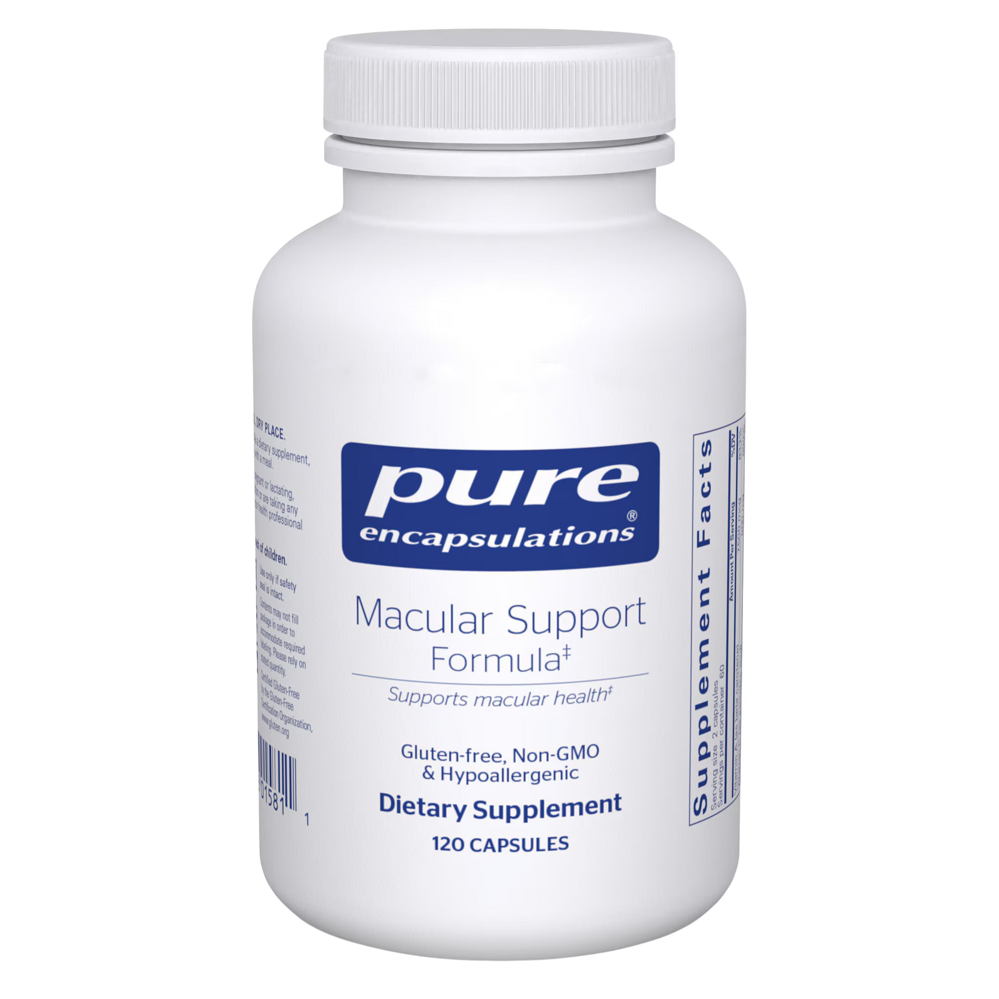 Macular Support Formula is a combination of antioxidants and botanicals designed to protect and support the macula, the central area of the retina responsible for sharp vision. Since the macula is extremely susceptible to free radical damage, research emphasizes the importance of antioxidant supplementation in maintaining and improving macular health. N-acetyl-l-cysteine (NAC), a glutathione precursor, has been shown to protect against oxidative damage to the lens and to support healthy glutathione levels. Glutathione is one of the natural antioxidants found in retinal tissues. Bilberry, a rich source of flavonoids known as anthocyanidins, may help moderate visual fatigue and improve light to dark adjustments. Grape seed extract provides polyphenols that also provide antioxidant support for the retina. This formula is also enhanced with lutein and zeaxanthin, the only two carotenoids found in macular pigment. Lutein and zeaxanthin promote the integrity and density of the macular pigment, as well as help maintain the health of the optical lens. These carotenoids and vitamin C provide antioxidant support for macular protection and ocular health.