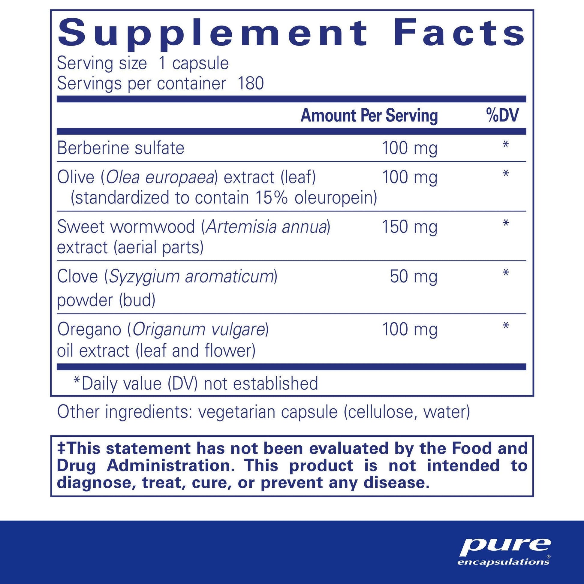 Artemisia, which contains artemisinin, has been used traditionally for thousands of years to promote healthy microbial balance within the body. Olive leaf extract contains the active constituent oleuropein, a phenolic glucoside that helps maintain healthy G.I. and respiratory tract microorganism balance and may help support immune function. Oregano oil powder offers antioxidant and microbial balancing properties. In vitro and animal research suggests that oregano oil and clove can diffuse through microbial cell membranes, promoting membrane permeability. Clove has been used traditionally to promote healthy fungal and microbial levels. Berberine sulfate is a highly concentrated microbial balancing compound.