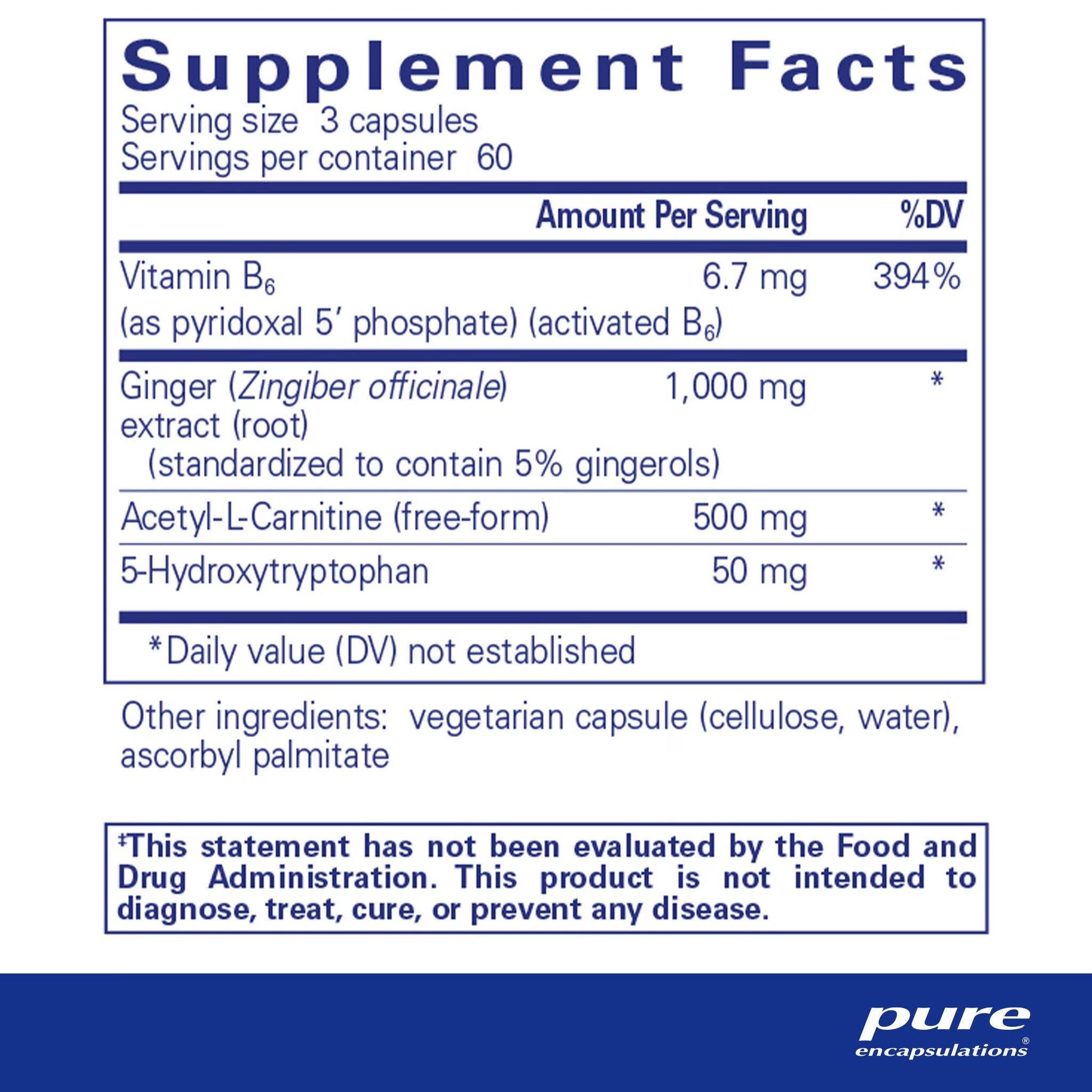 MotilPro supports serotonergic and cholinergic neurotransmission in the G.I. tract. 5-HTP is absorbed by enterochromaffin cells in the epitheliumand is decarboxylated to serotonin using pyridoxal 5' phosphate as a cofactor. Serotonin stimulates enteric neurons through activation of 5-HT4receptors, which contribute to healthy motility. Ginger modulates serotonin signaling by additional 5-HT4 stimulation and by modulating serotonin type 3 (5-HT3) receptors in the enteric nervous system and brain stem, supporting gastric emptying, intestinal transit, healthy visceral sensation and upper G.I. comfort. Acetyl-l-carnitine supports autonomic neuronal health.