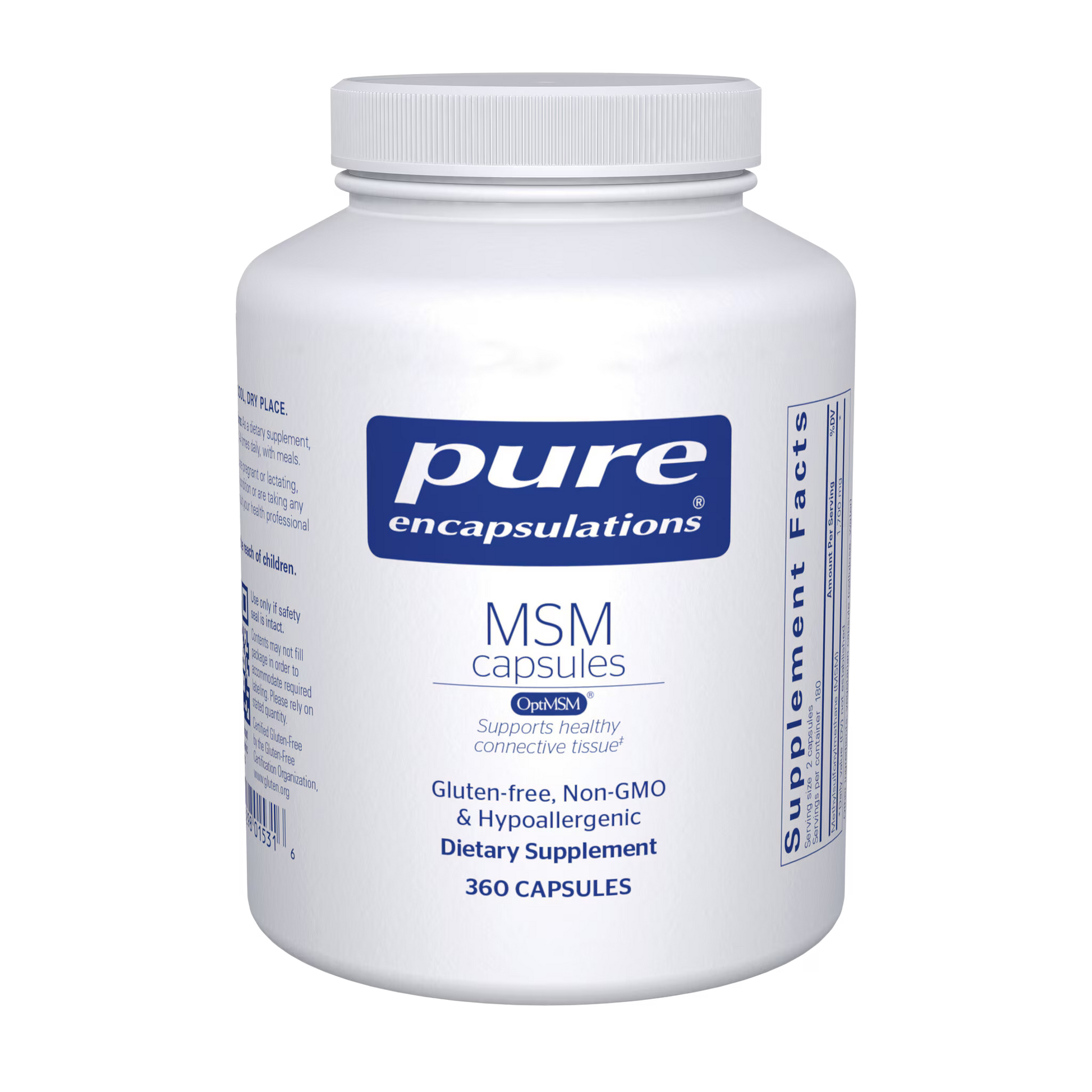 Pure Encapsulations' MSM (methylsulfonylmethane or dimethylsulfone) is a source of organic sulfur found naturally in the human body. MSM, the major metabolite of DMSO (dimethyl sulfoxide), is 34% elemental sulfur, acompound which is crucial in maintaining healthy tissues. While sulfur supports many functions, it is well known for maintaining connective tissue health. Sulfur also supports tissue containing significant amounts of collagen and keratin, including hair, skin and nails. Sulfur is essential in methionine, cysteine and serum protein metabolism. Preliminary evidence suggests that MSM may also provide potential support for healthy immune and respiratory function.